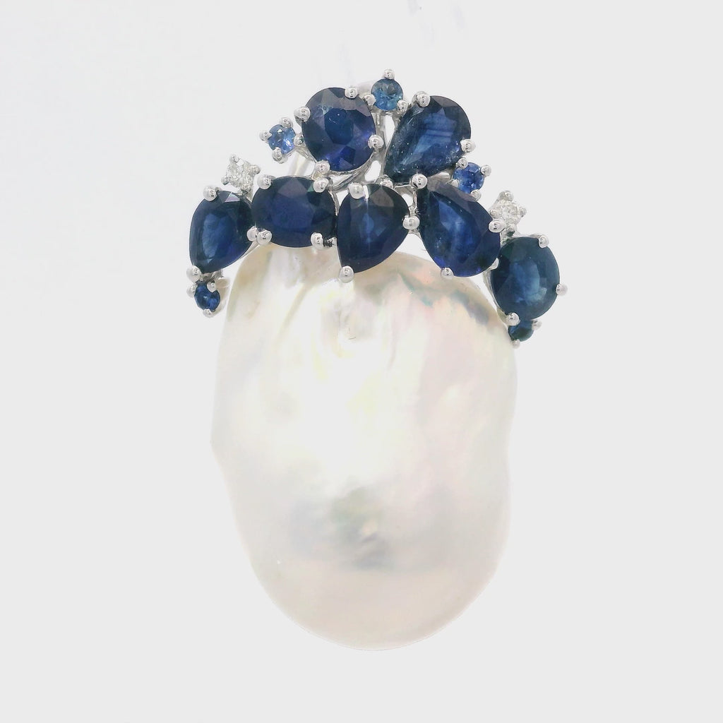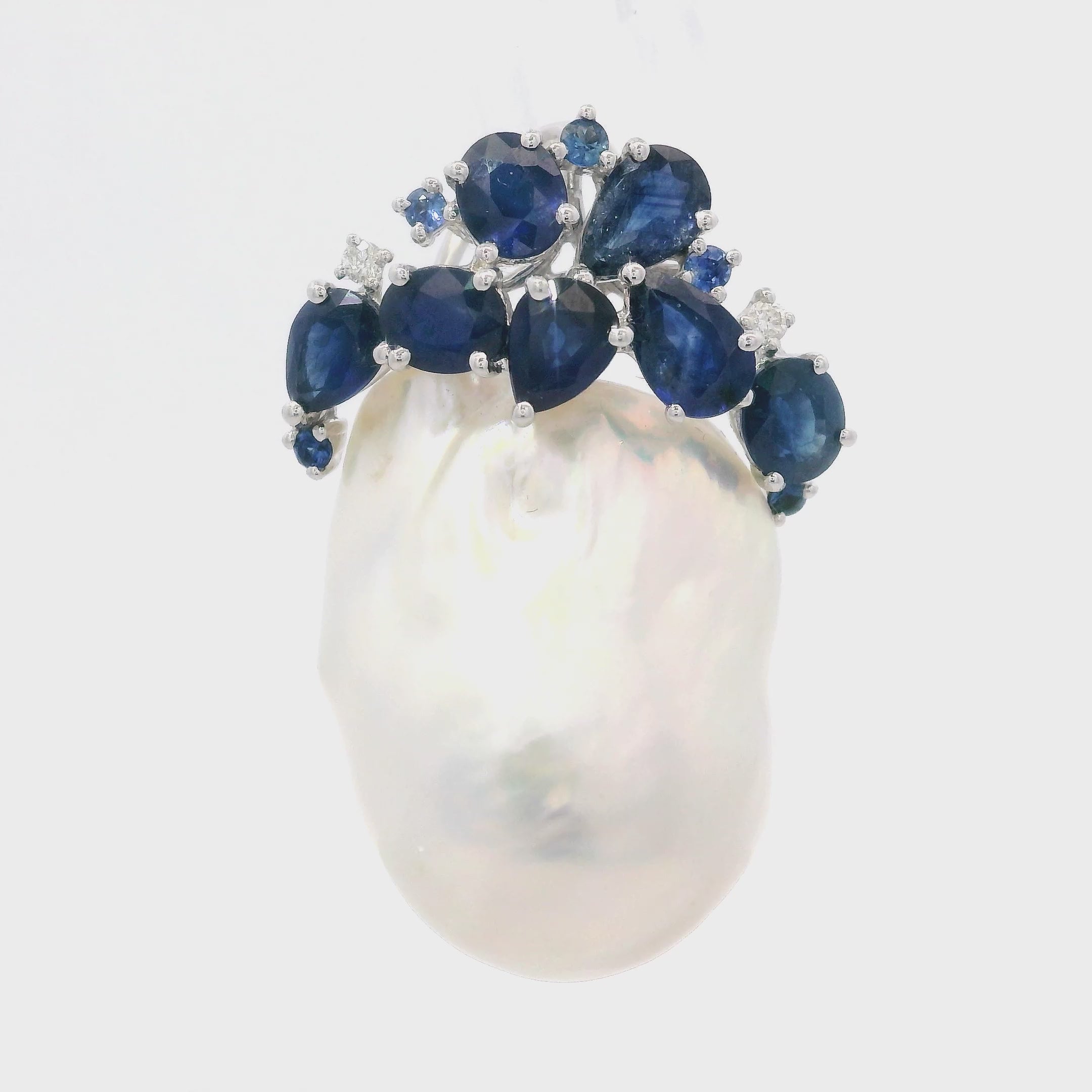 Colgante de diseño sofisticado que combina la elegancia clásica con detalles contemporáneos. Elaborado en oro blanco de 18 quilates, presenta un cautivador racimo de zafiros azules de 0.04 quilates que rodea una perla barroca de 3.15 quilates. La perla barroca aporta textura orgánica y movimiento, mientras que los diamantes añaden brillo y refinamiento. Una pieza versátil que complementa tanto atuendos formales como casuales, perfecta para quien aprecia la joyería de calidad y diseño distintivo.