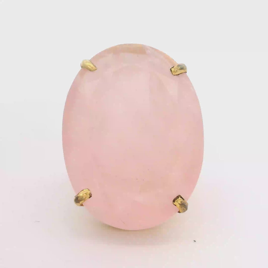 Elegant ring showcasing a large oval rose quartz. A soft pink gem that symbolizes love and serenity in a classic setting.