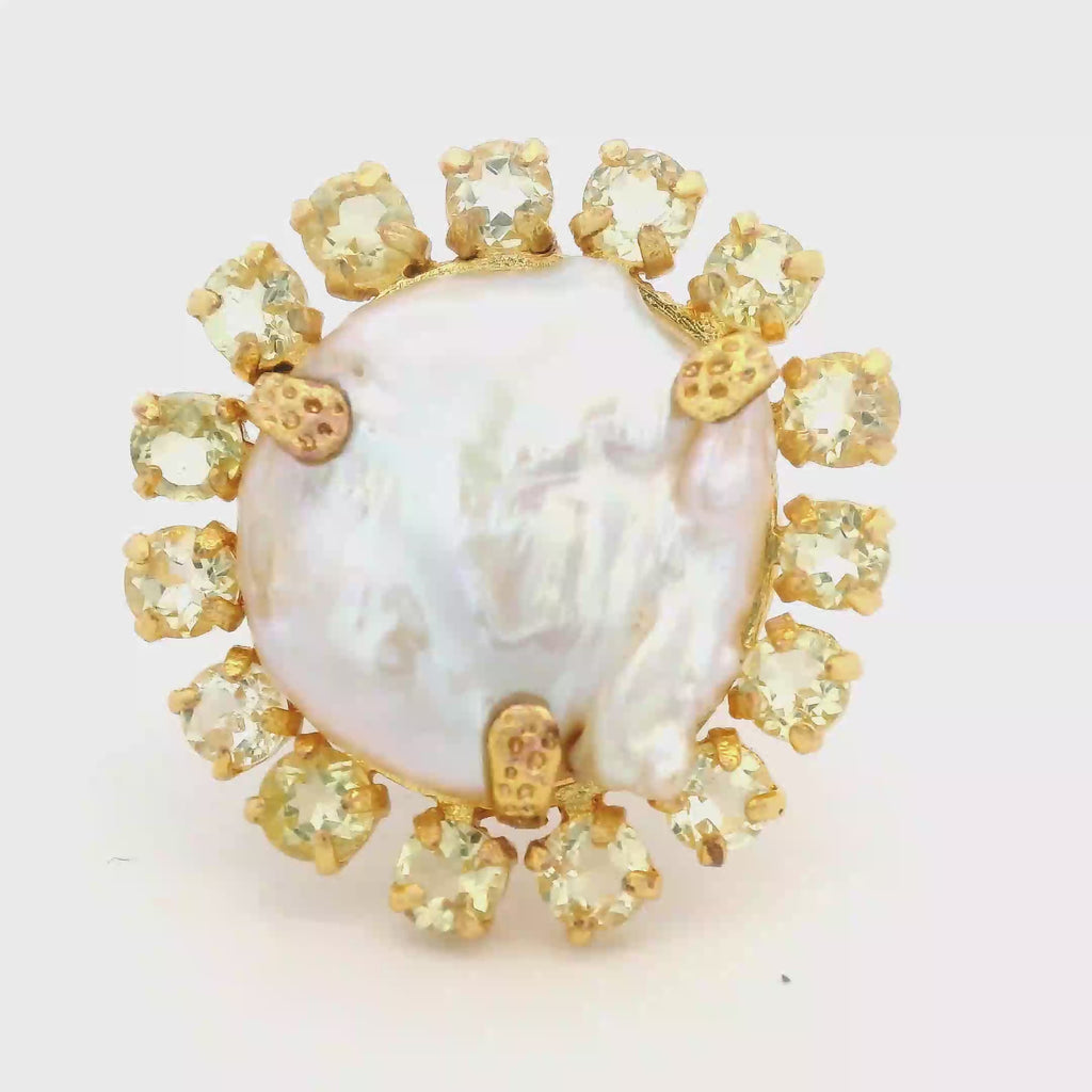 RING 15 MM ROUND COIN PEARL SURROUNDED WITH ROUND LEMON QUARTZ