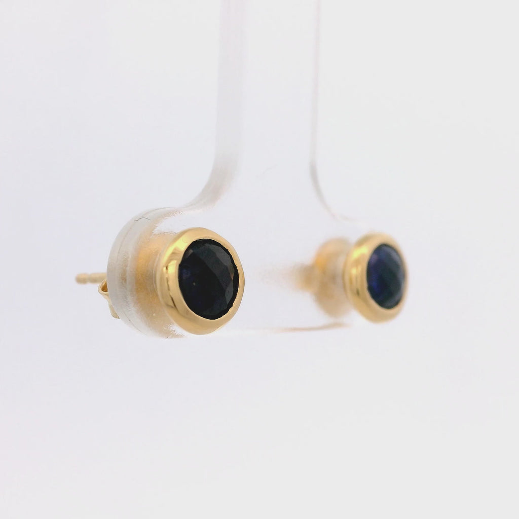 Aretes de Botón con Zafiro Relleno de Vidrio y Engaste de Bisel en Plata 925 Bañada en Oro.