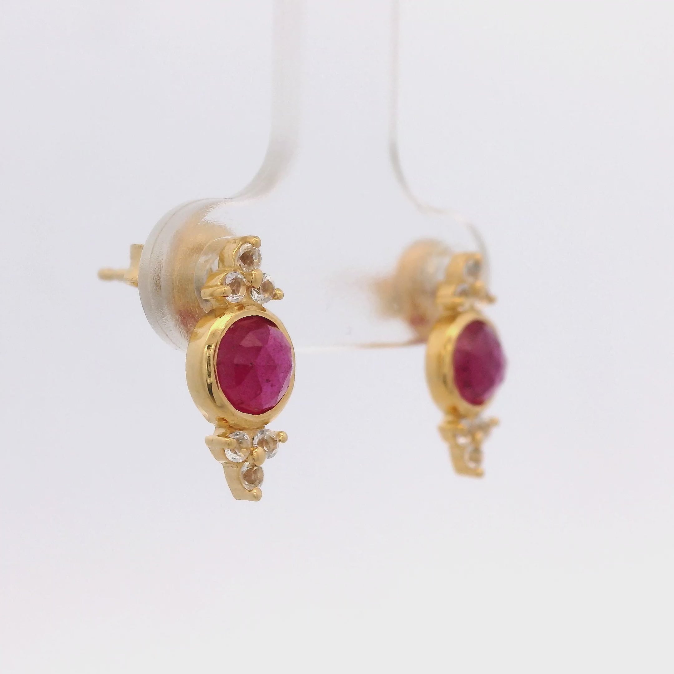 Aretes de Rubí Tratado con Vidrio y Puntas de Topacio Blanco en Plata 925 Bañada en Oro.