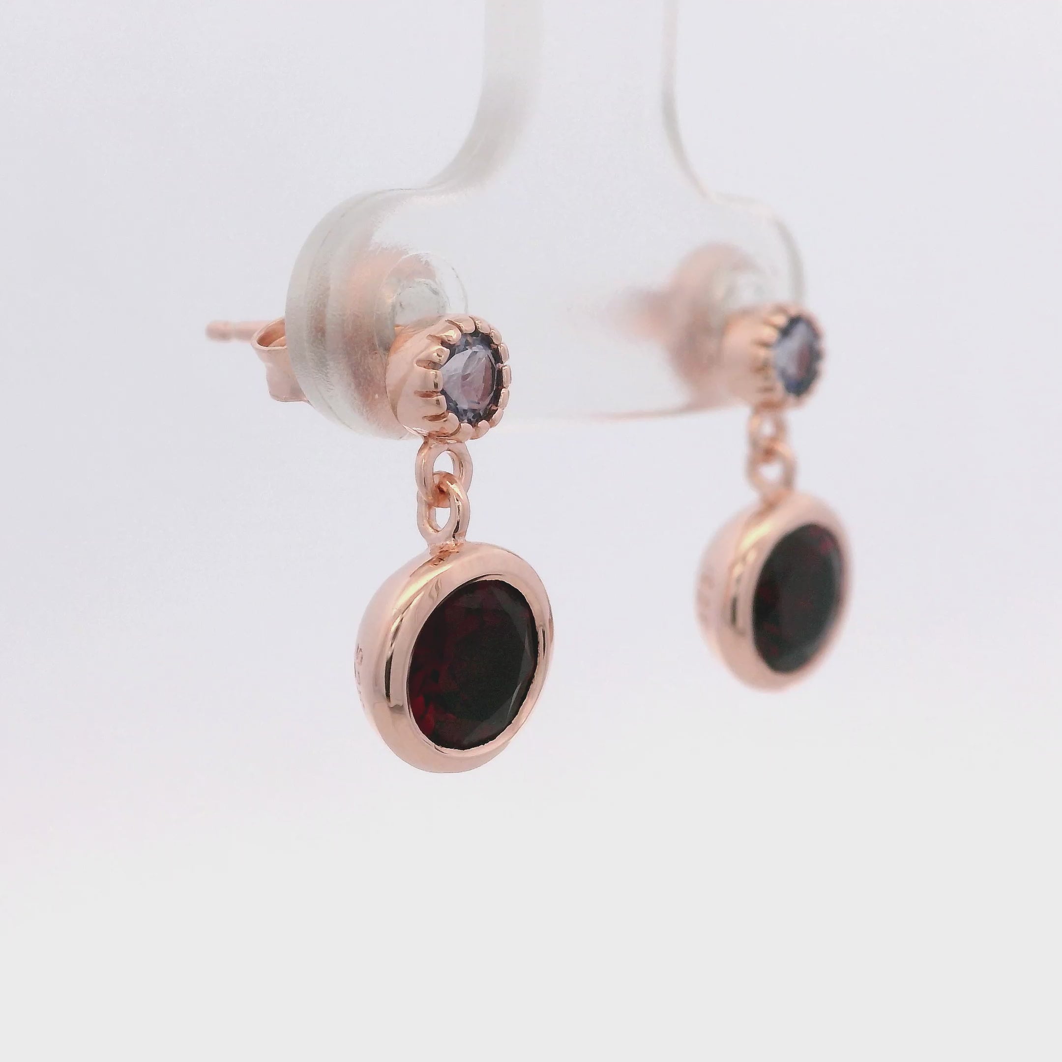 Aretes con Iolita y Domo de Granate con Engaste de Bisel en Plata 925 Bañada en Oro Rosa.