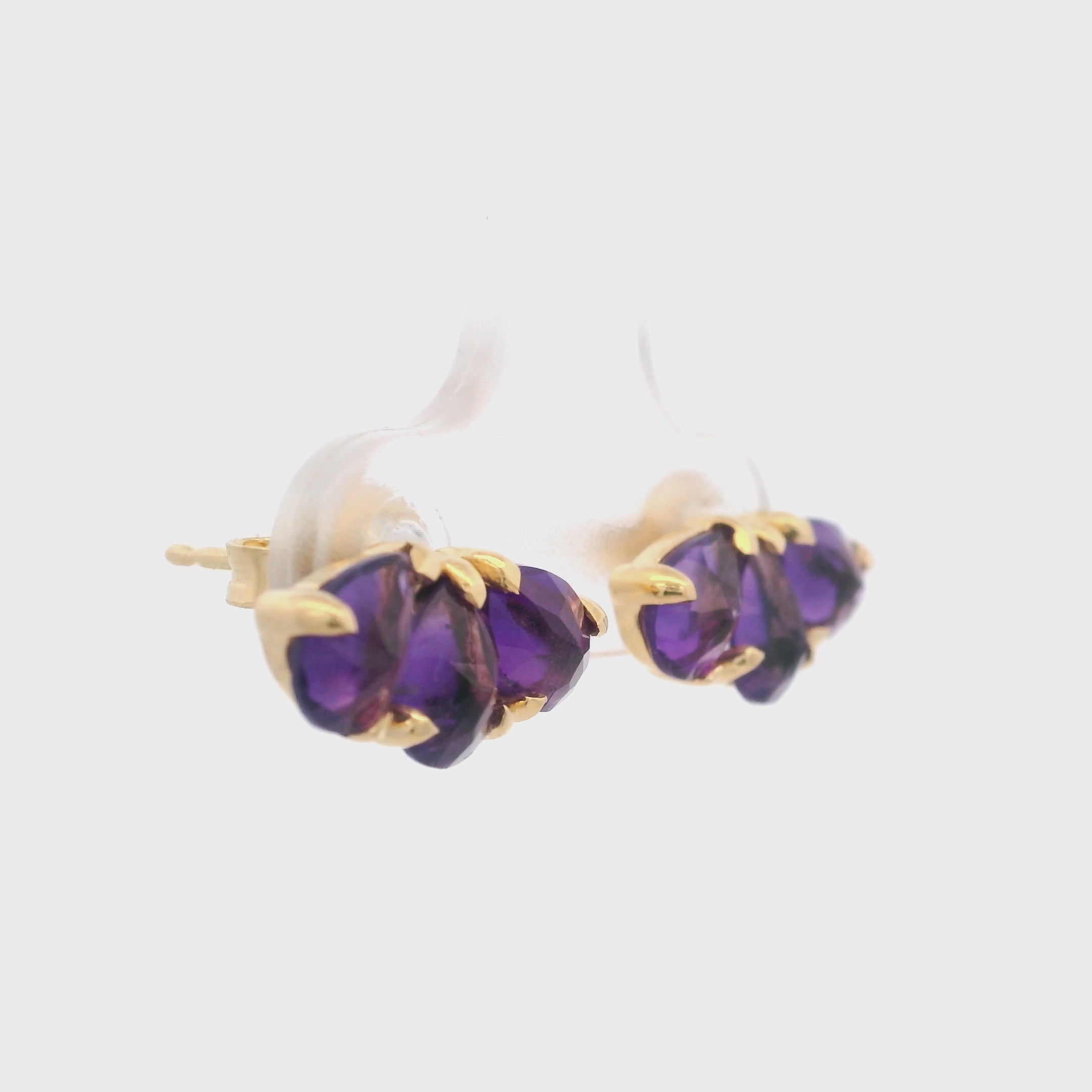 Diseño: Aretes colgantes (estilo "drop") compuestos por tres piedras de amatista que caen en secuencia, una debajo de la otra.