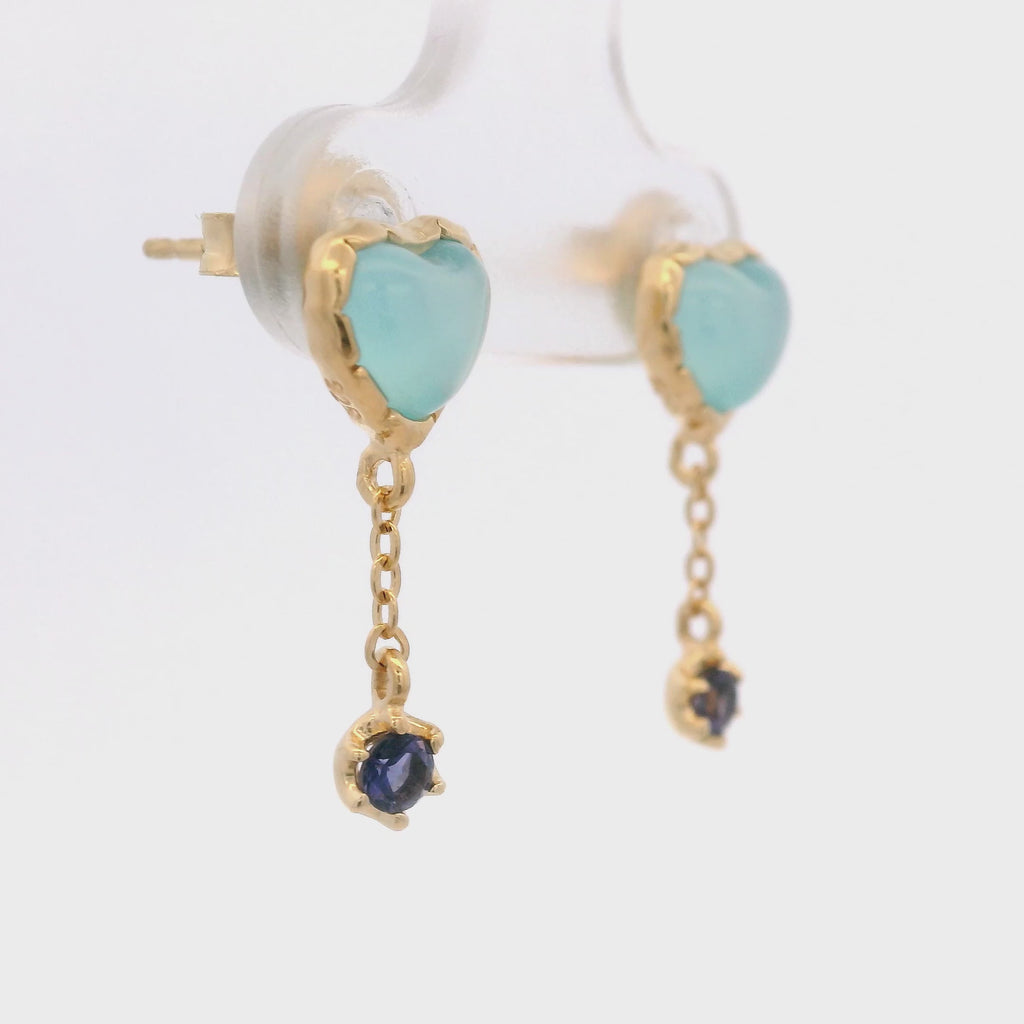 Aretes de Cadena con Corazón de Calcedonia e Iolita en Plata 925 Bañada en Oro.