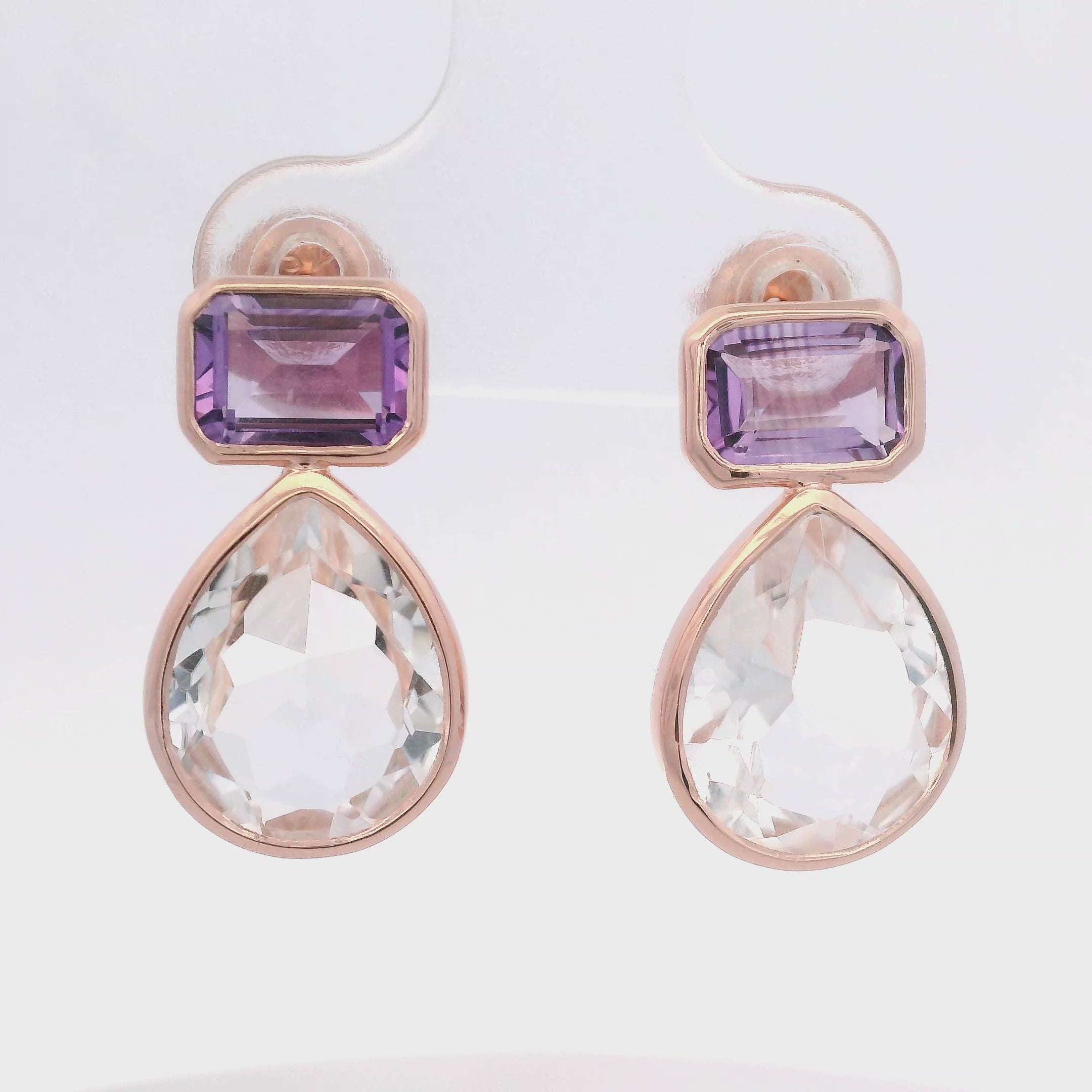 Aretes Colgantes de Amatista corte Baguette y Cristal de Roca en Plata 925 Bañada en Oro Rosa.