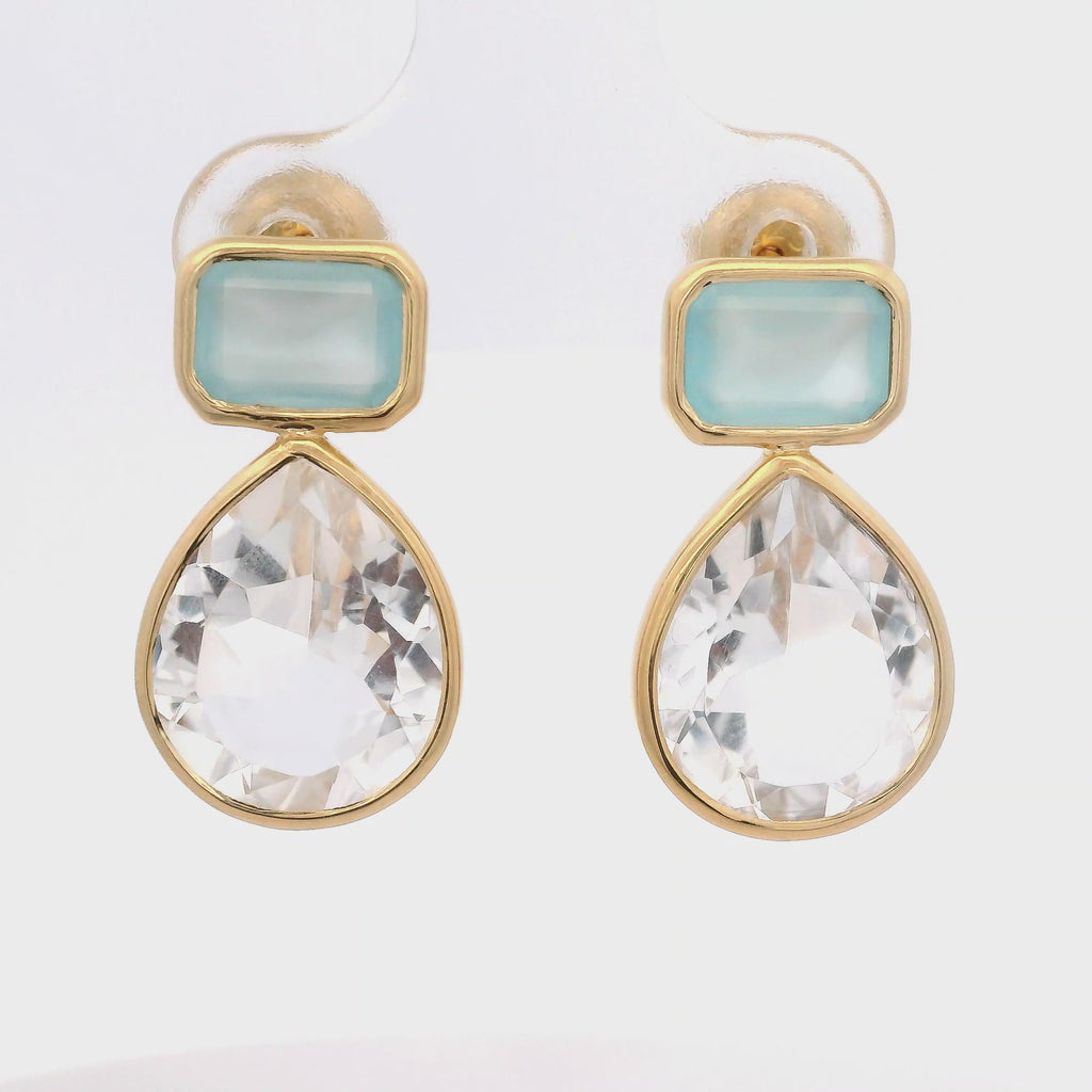 Aretes Colgantes de Calcedonia corte Baguette y Cristal de Roca en Plata 925 Bañada en Oro.