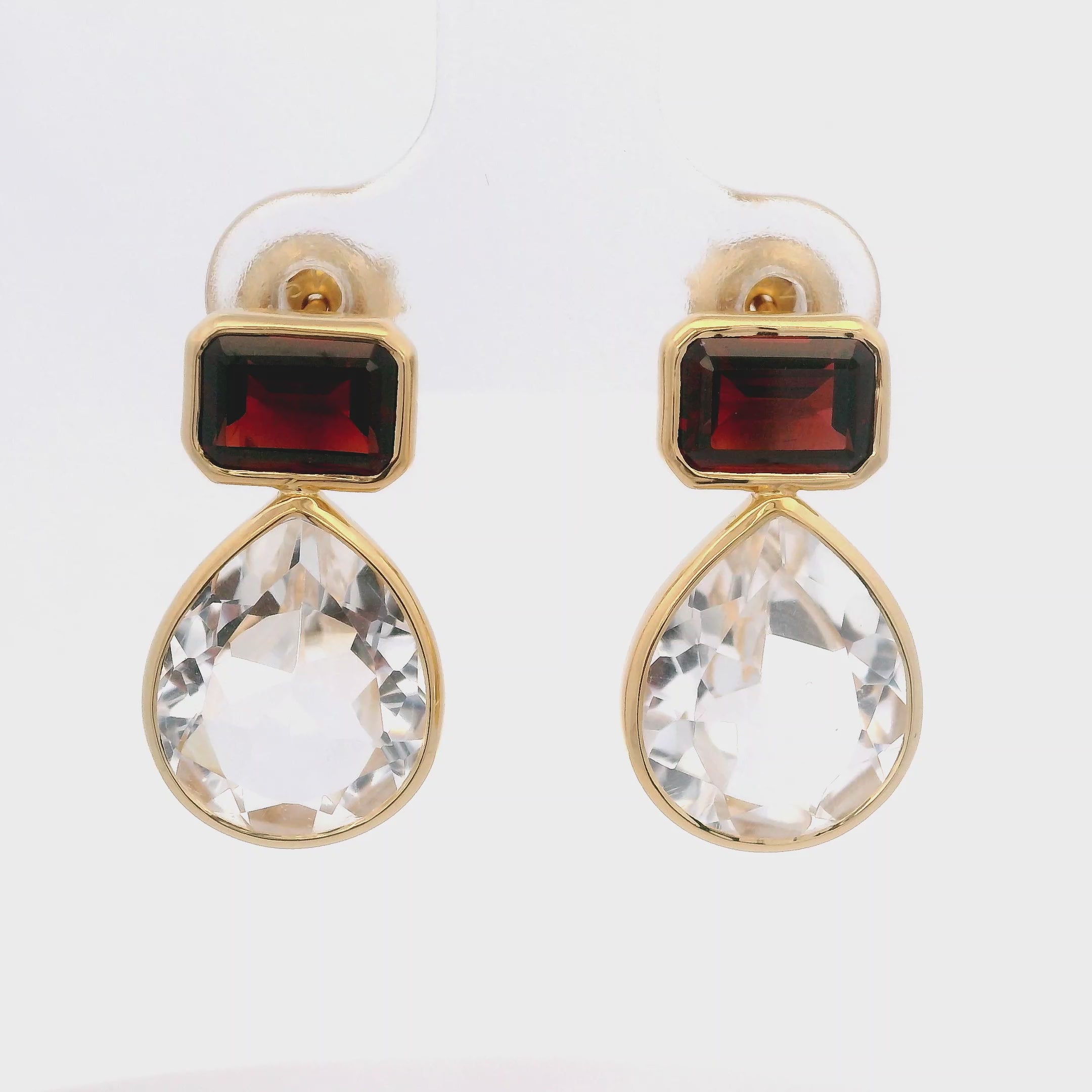 Aretes Colgantes de Granate corte Baguette y Cristal de Roca en Plata 925 Bañada en Oro.