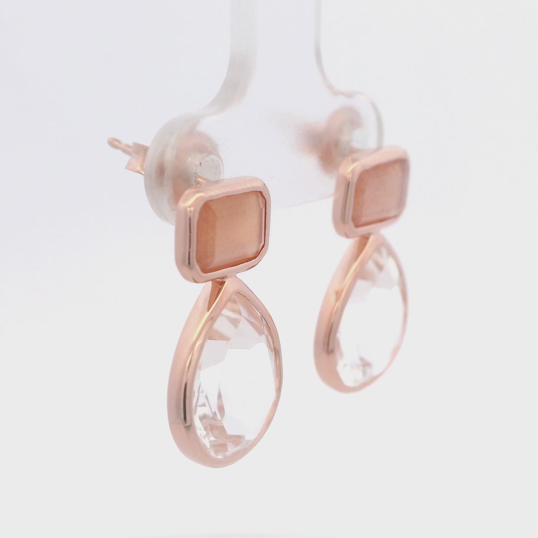 Aretes Colgantes de Piedra Luna Durazno corte Baguette y Cristal de Roca en Plata 925 Bañada en Oro Rosa.