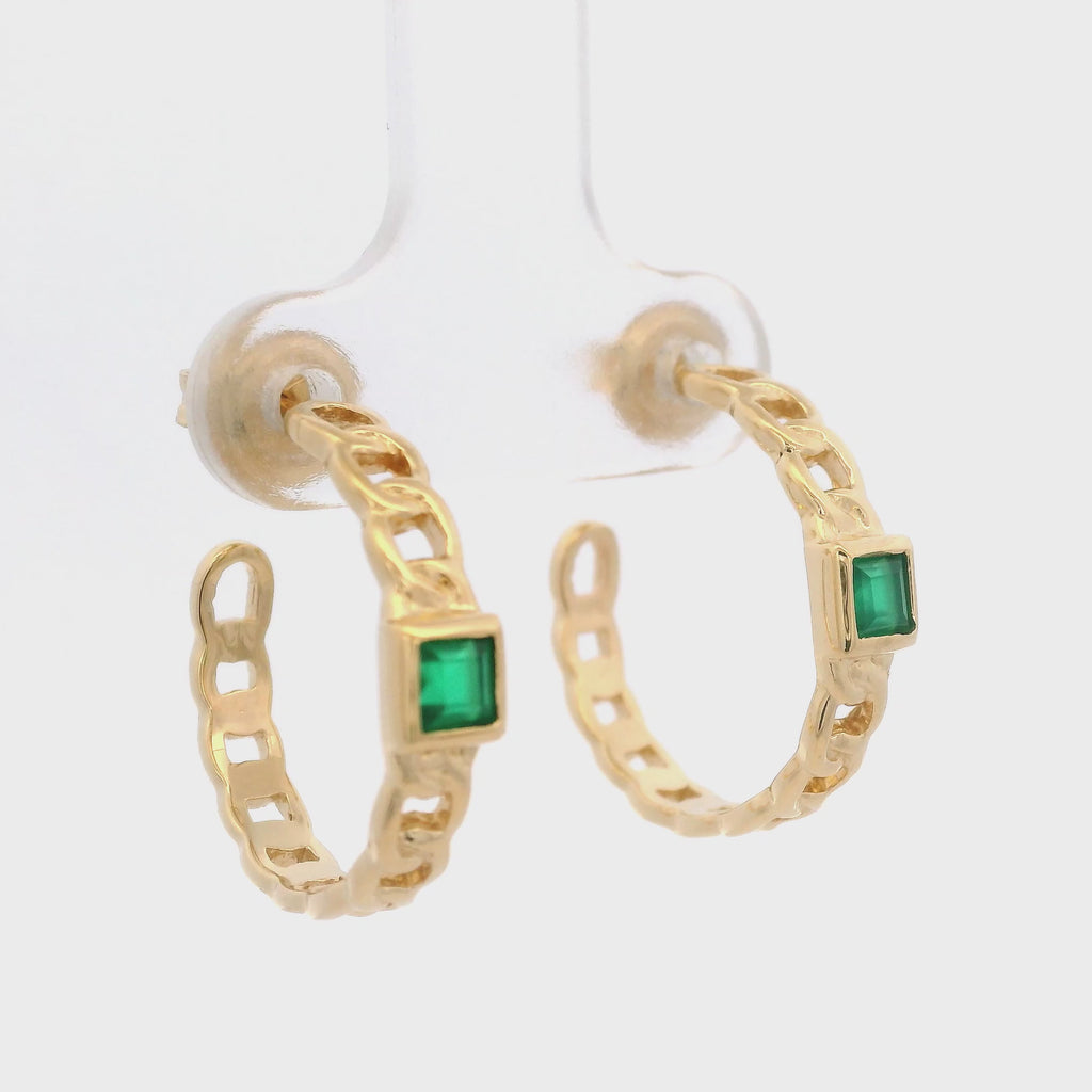 Huggies de Eslabón Cubano con Ónix Verde Cuadrado en Plata 925 Bañada en Oro.