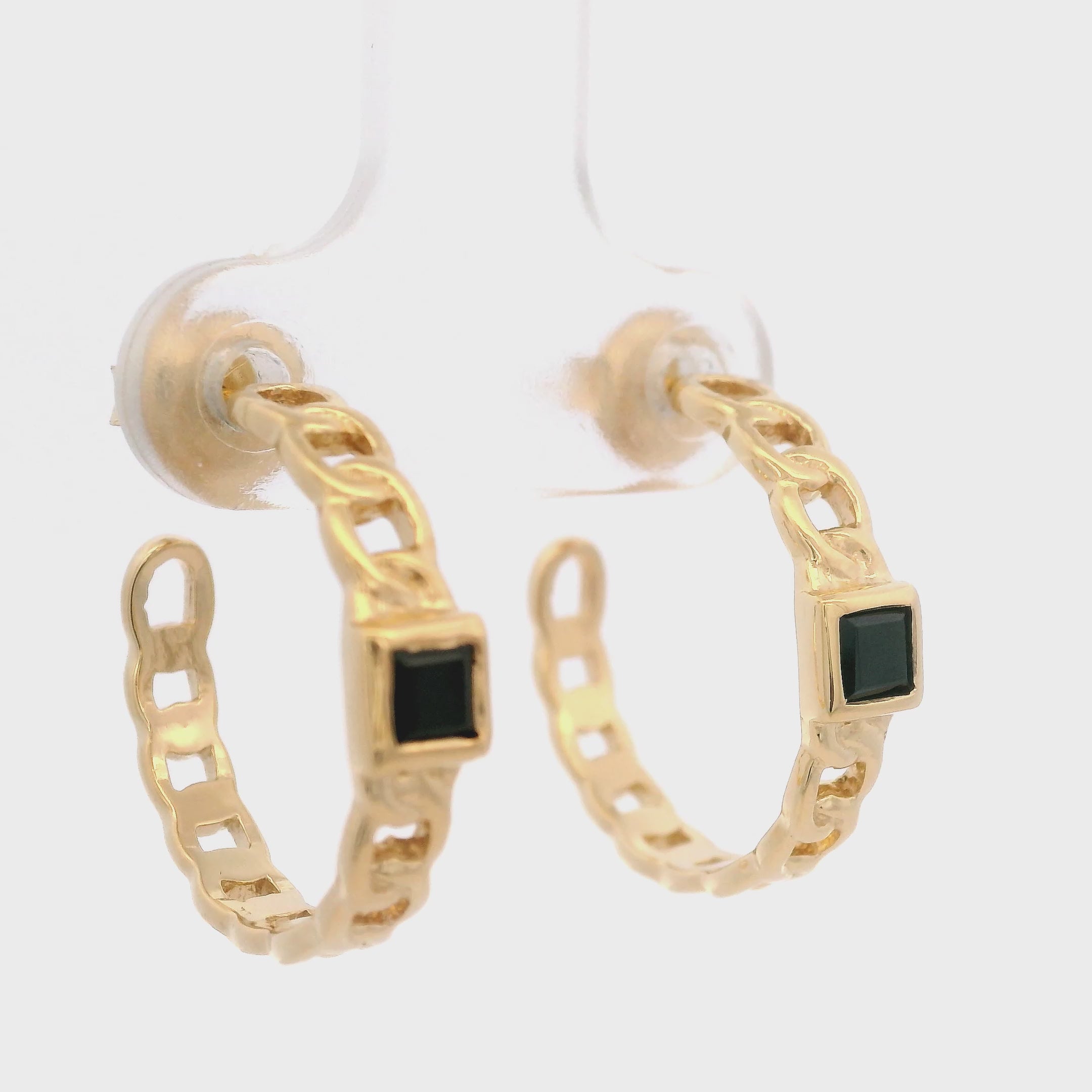Huggies de Eslabón Cubano con Espinela Negra Cuadrada en Plata 925 Bañada en Oro.