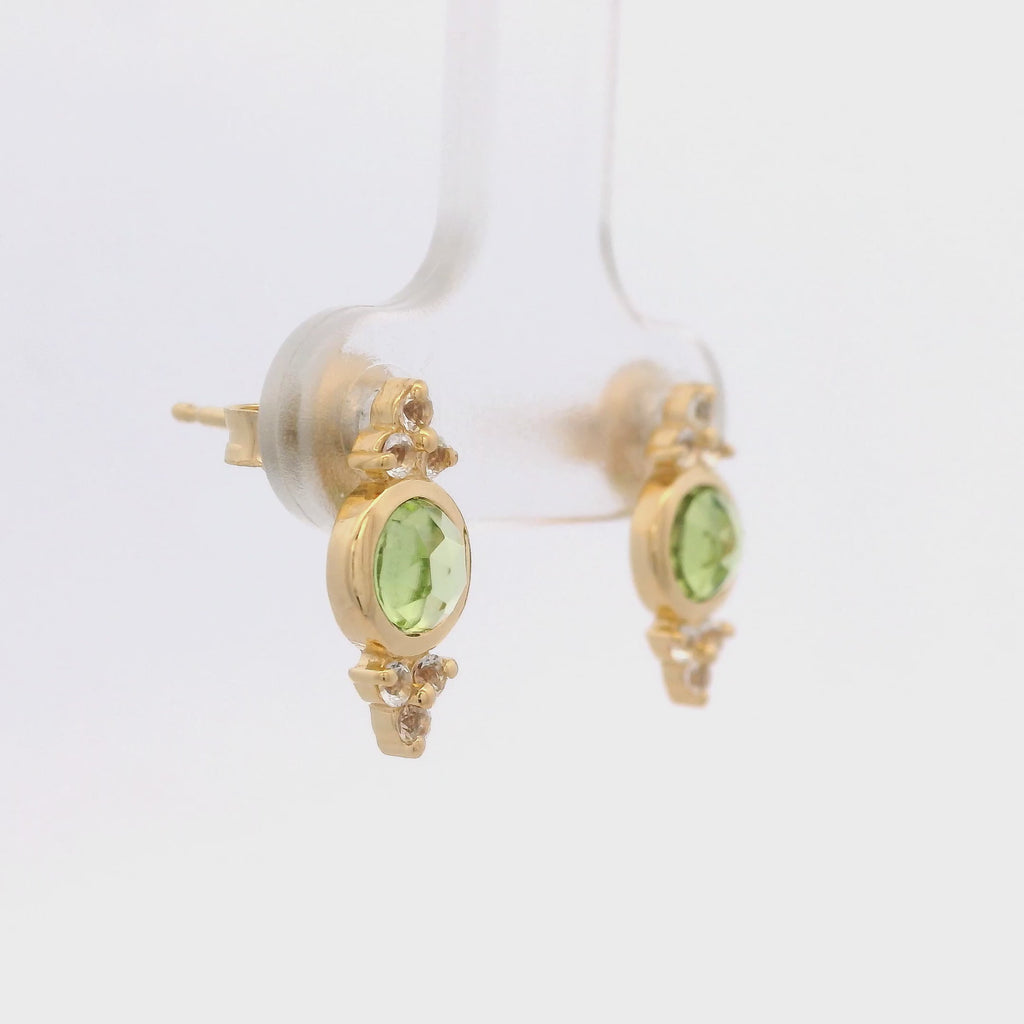 Aretes de Peridoto con Engaste de Bisel y Puntas de Topacio Blanco en Plata 925 Bañada en Oro.