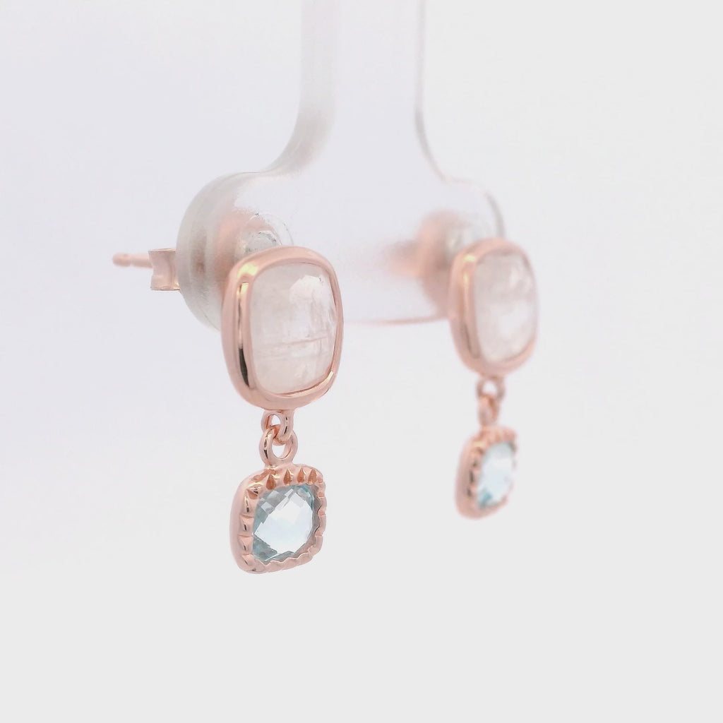 Aretes Dobles Cuadrados de Piedra Luna con Topacio Azul en Plata 925 Bañada en Oro Rosa.