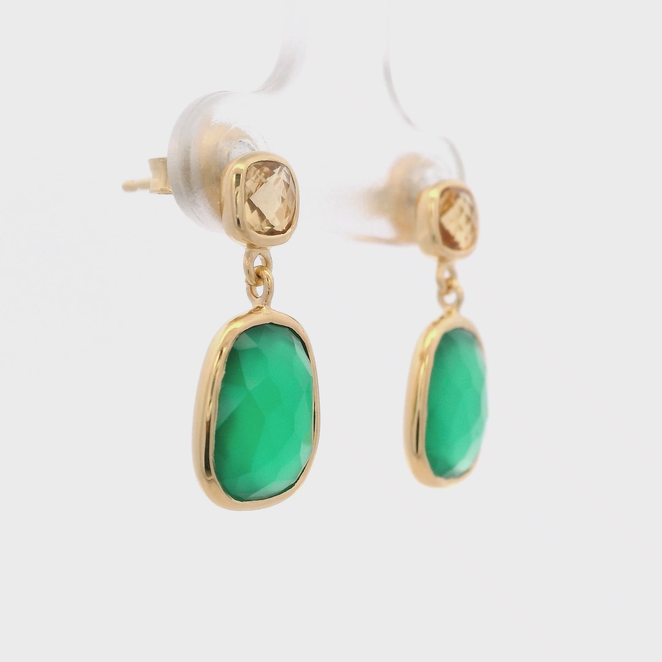 Aretes de Topo de Citrino con Ónix Verde Colgante en Plata 925 Bañada en Oro.