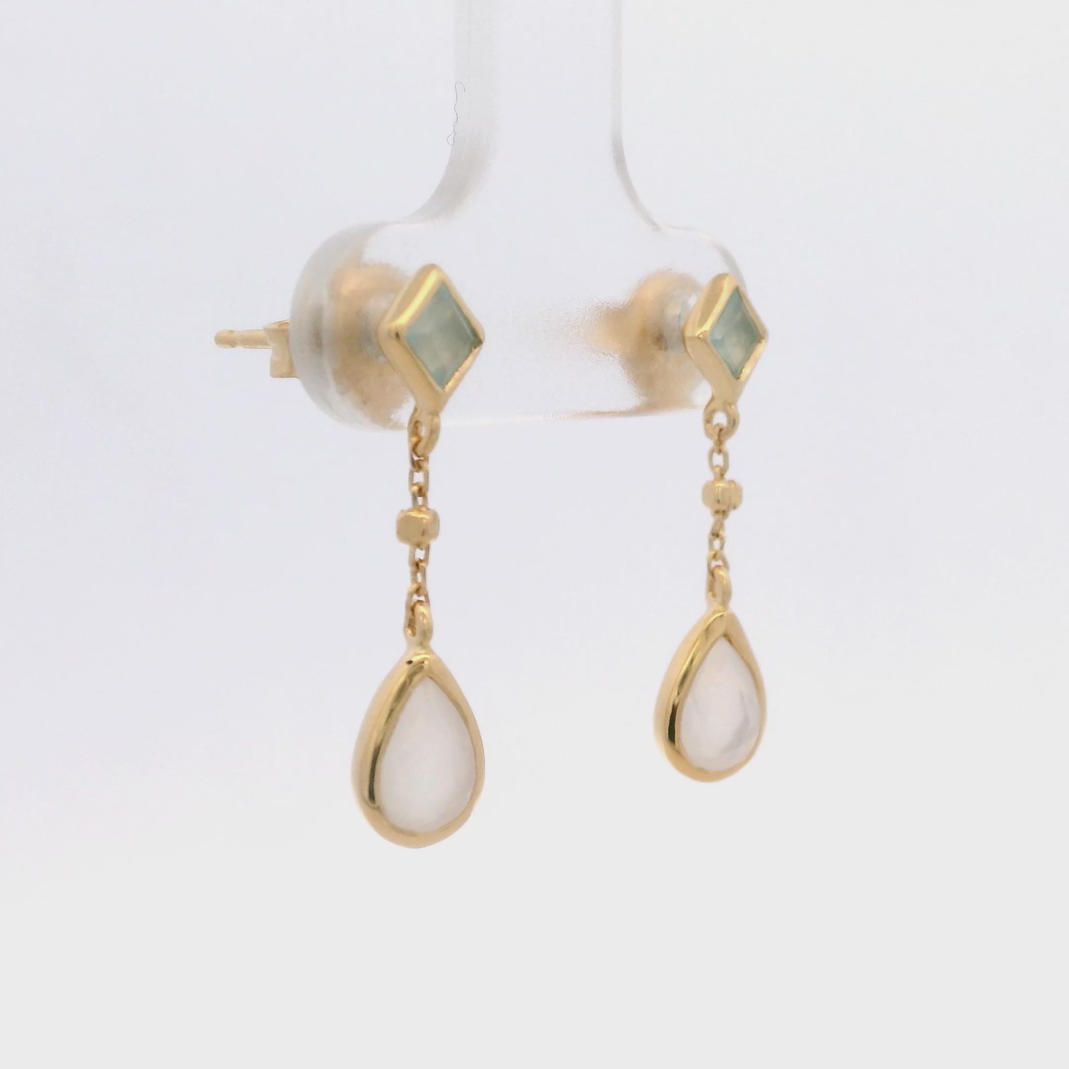 Aretes Colgantes de Cadena con Rombo de Calcedonia y Piedra Luna en Plata 925 Bañada en Oro.