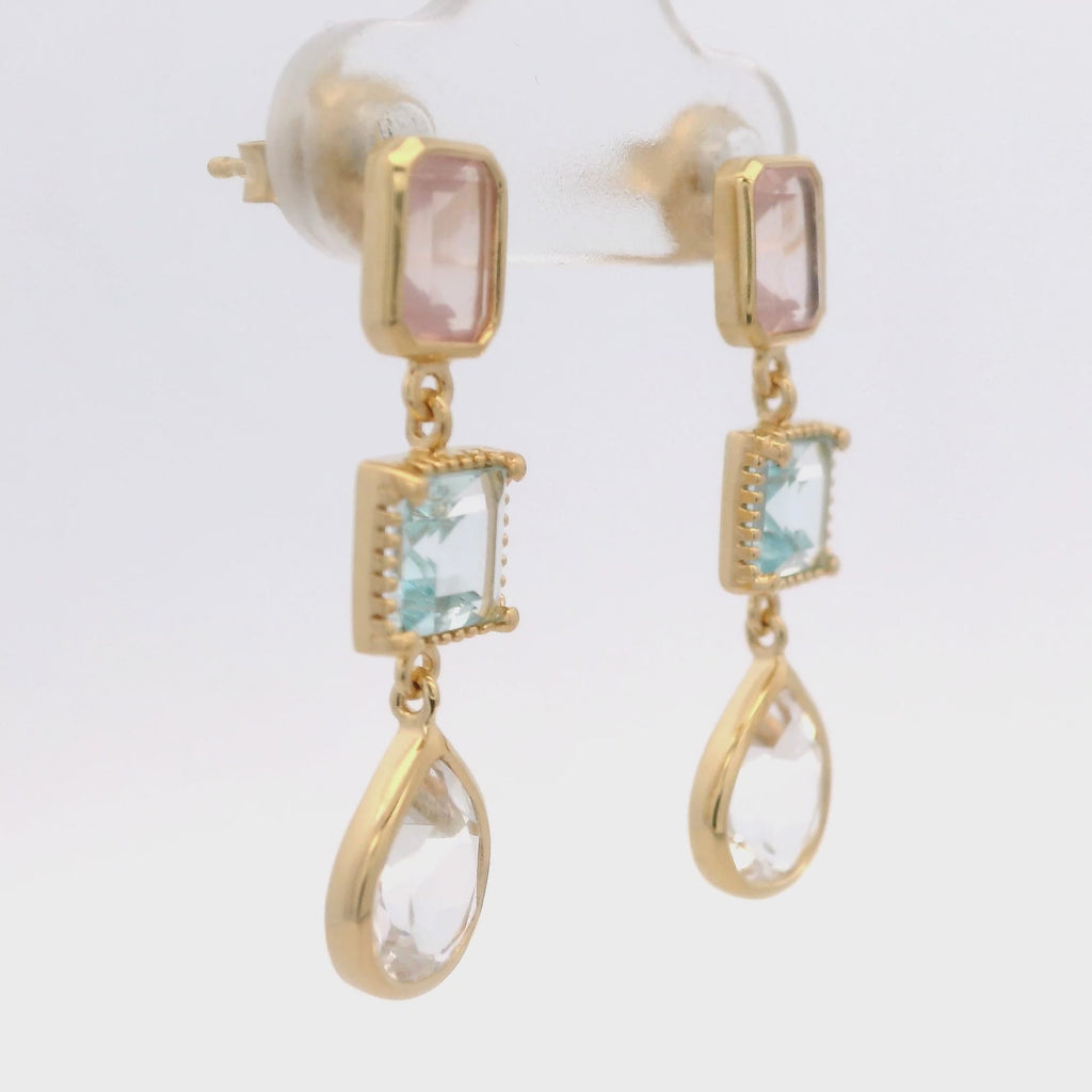 Aretes Colgantes Multiforma con Cristal de Roca y Topacio Azul en Plata 925 Bañada en Oro.