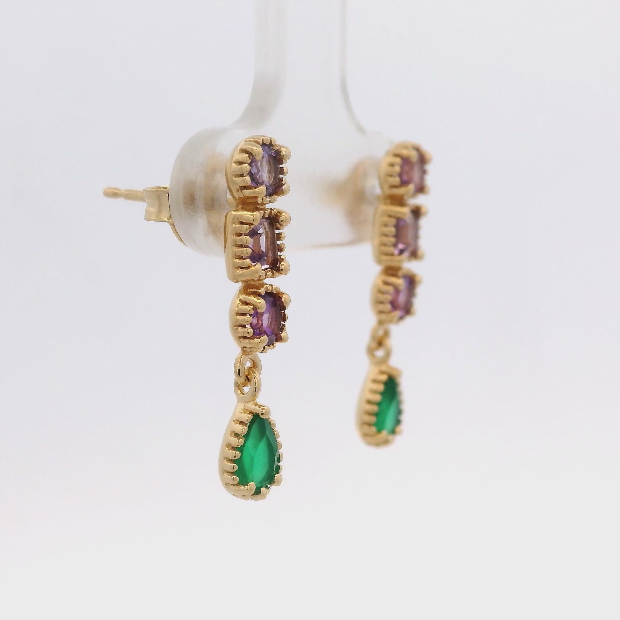 Aretes Colgantes Multiforma con Amatista y Ónix Verde en Plata 925 Bañada en Oro.