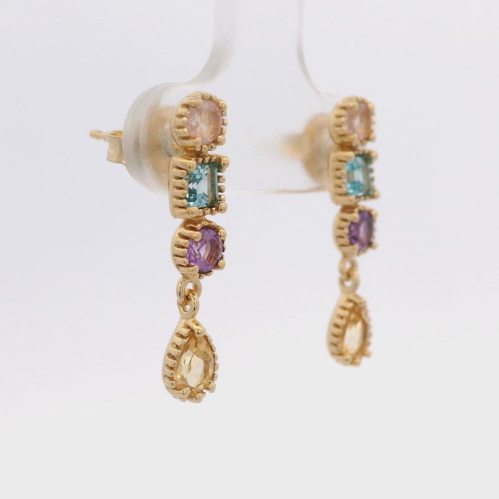 Aretes Colgantes Multiforma y Multipiedra con Citrino en Plata 925 Bañada en Oro.