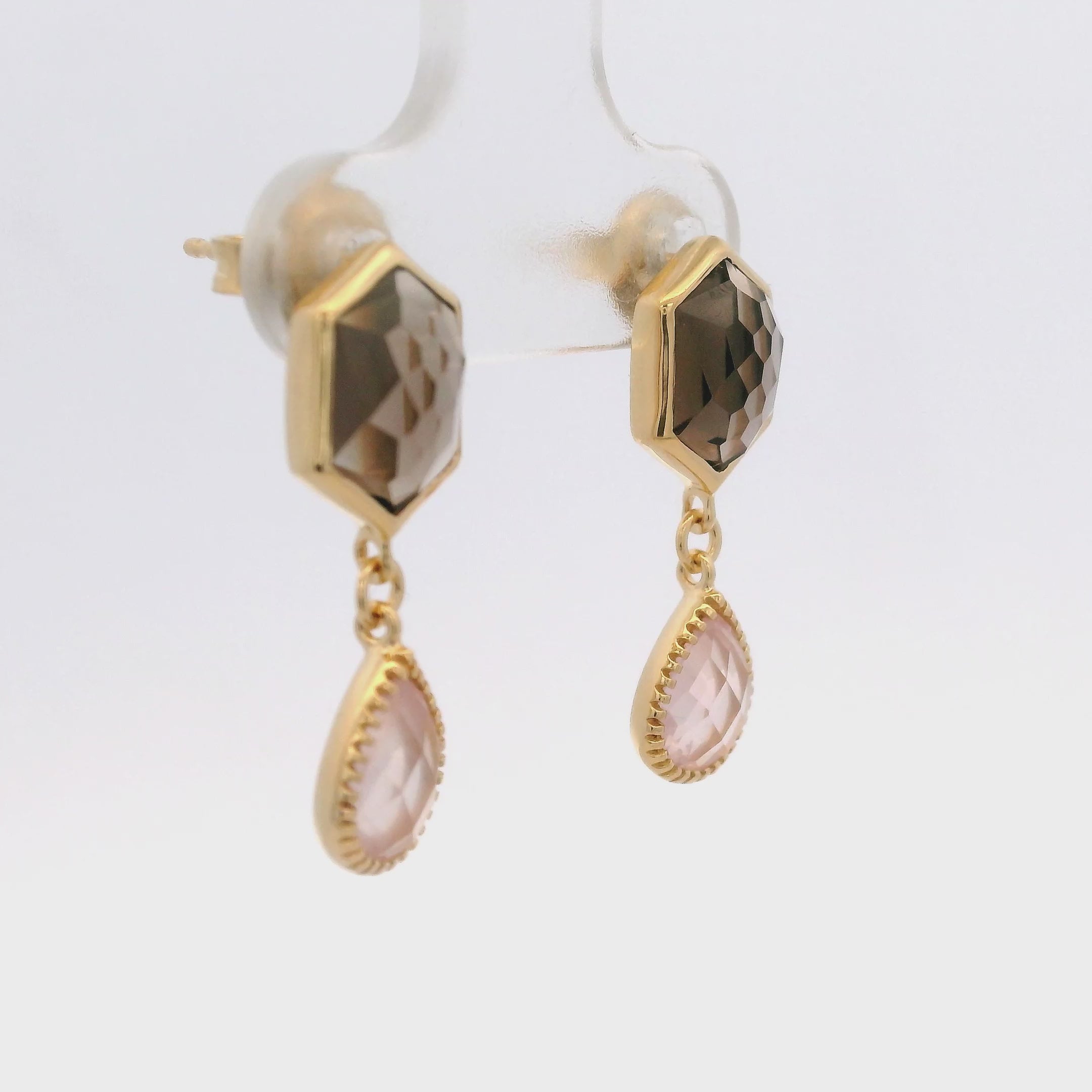 Aretes Colgantes de Cuarzo Ahumado Hexagonal y Gota de Cuarzo Rosa en Plata 925 Bañada en Oro.