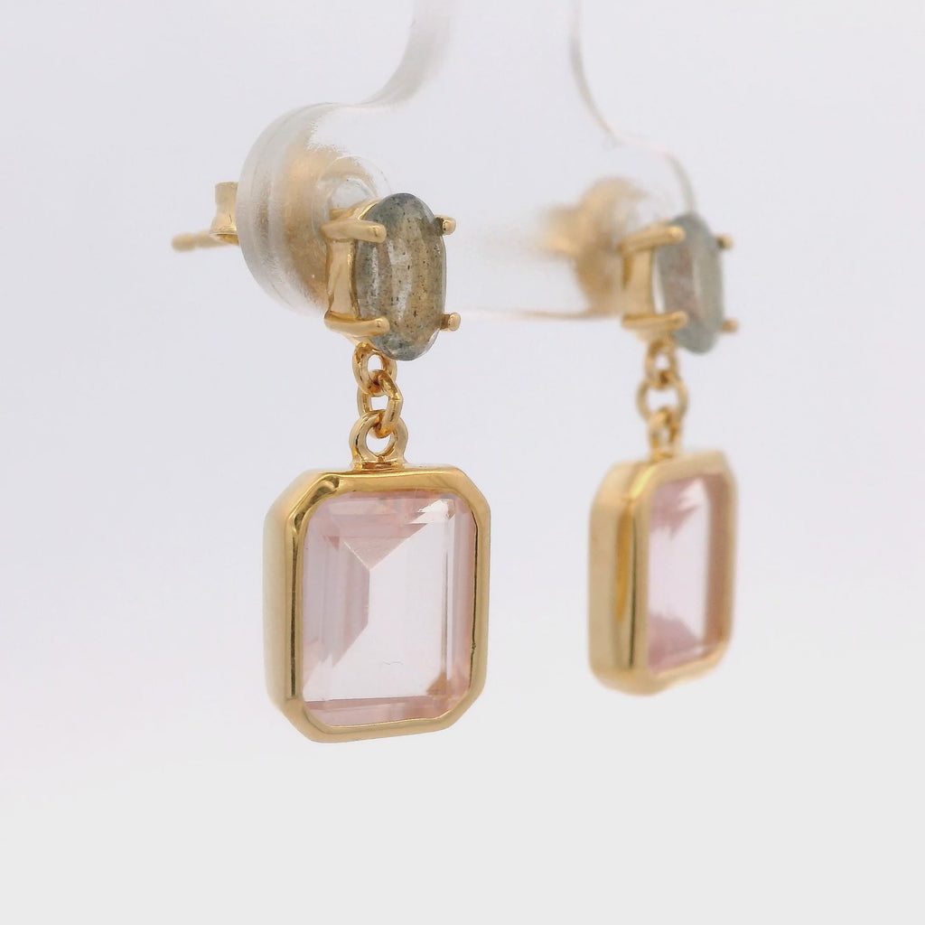 Aretes Colgantes de Labradorita y Cuarzo Rosa Rectangular en Plata 925 Bañada en Oro.