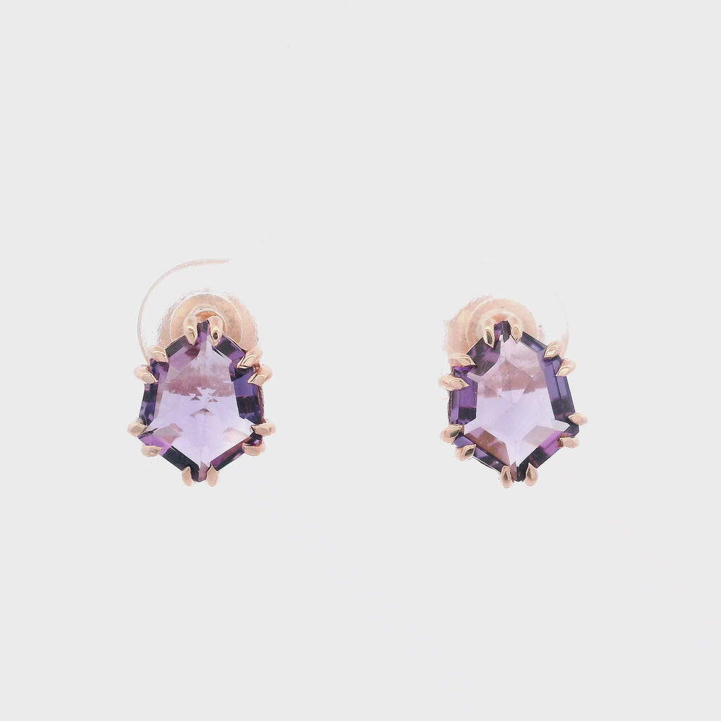 Elegantes y con un toque de color intenso, estos son un par de aretes de botón (stud earrings) que presentan una distintiva gema de amatista en un corte geométrico. El diseño es llamativo, fusionando la forma moderna con el color clásico de la piedra.