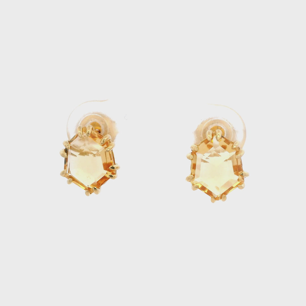 Se trata de un par de aretes de botón (stud earrings) que presentan una gema de Citrino de color amarillo-dorado brillante, tallada en una forma hexagonal y engastada en una montura de oro amarillo. El diseño es moderno y geométrico, enfocado en destacar la vibrante calidez del citrino.
