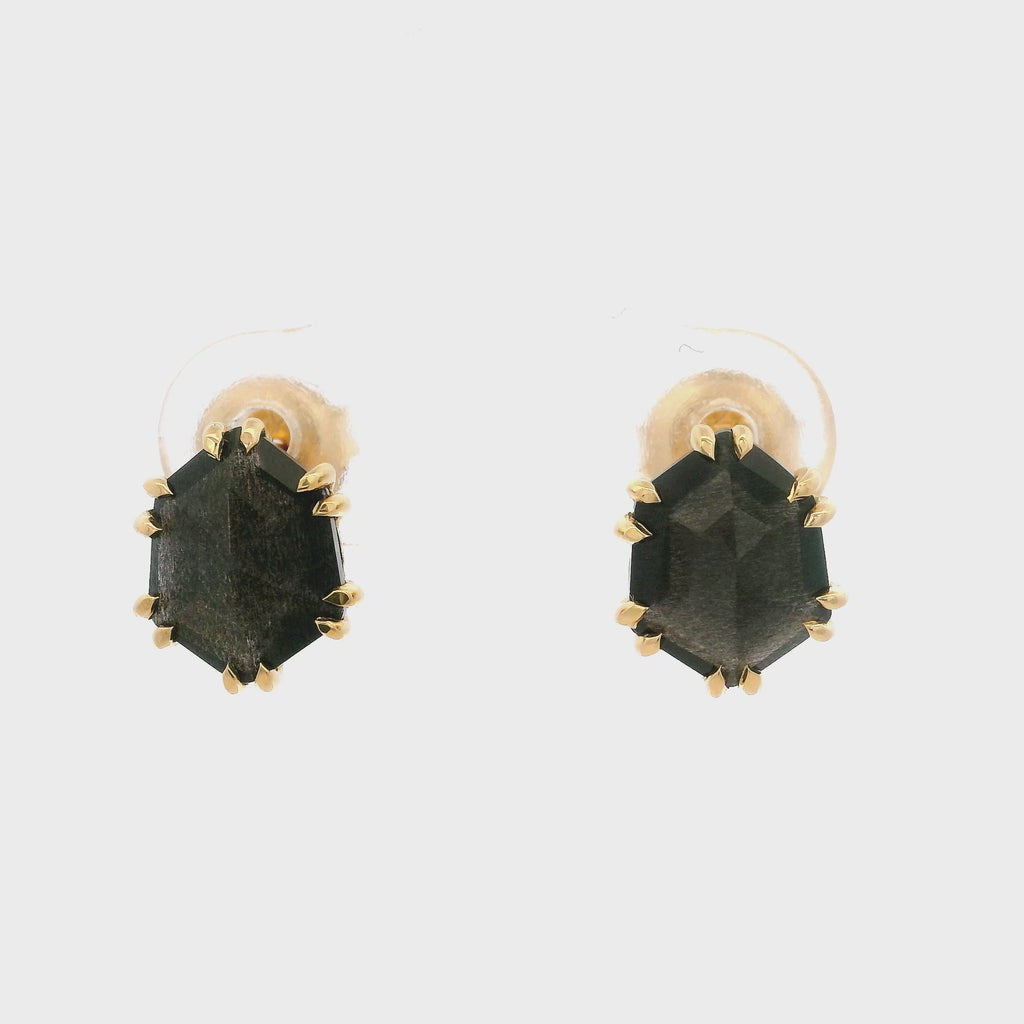 Se trata de un par de aretes de botón (stud earrings) con un diseño geométrico y moderno. Cada arete presenta una piedra central de labradorita negra con un corte facetado en forma de hexágono. El engaste es de estilo garra o puntas, elaborado en metal con un acabado de color oro amarillo, lo que sugiere el detalle "YG" (Yellow Gold).