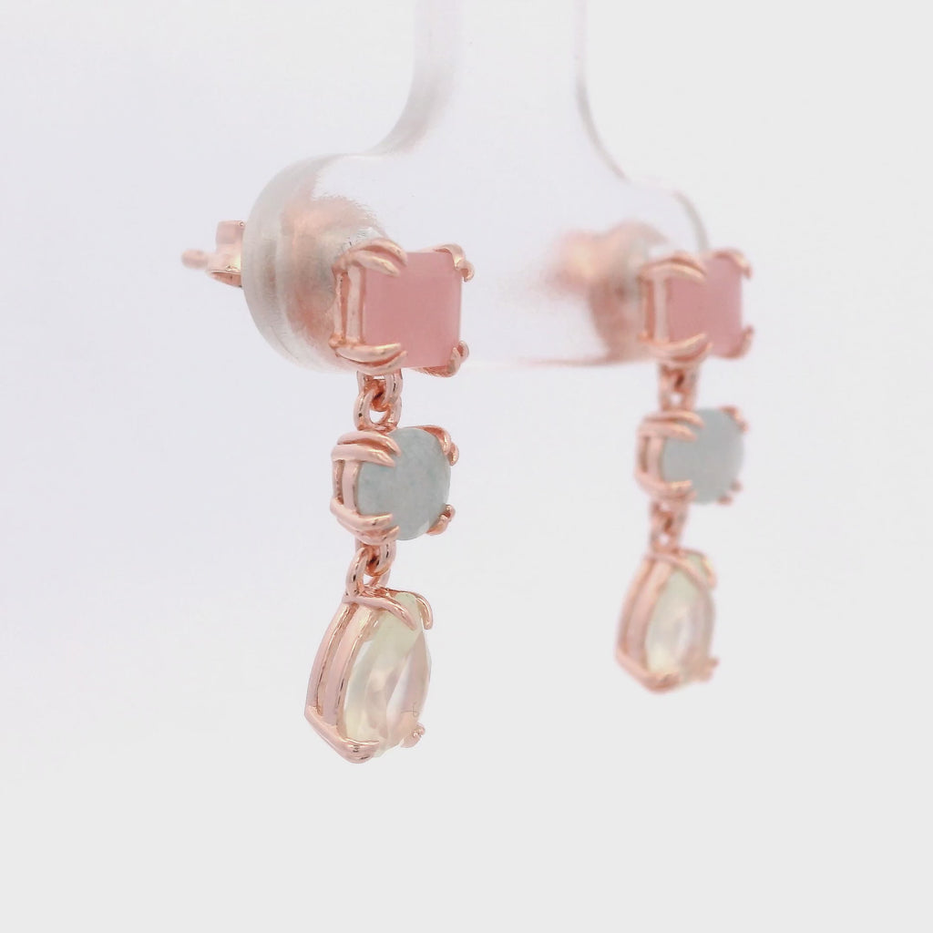 Aretes Multiforma de Cuarzo Rosa, Cuarzo Aqua y Prehnita en Plata 925 Bañada en Oro Rosa.
