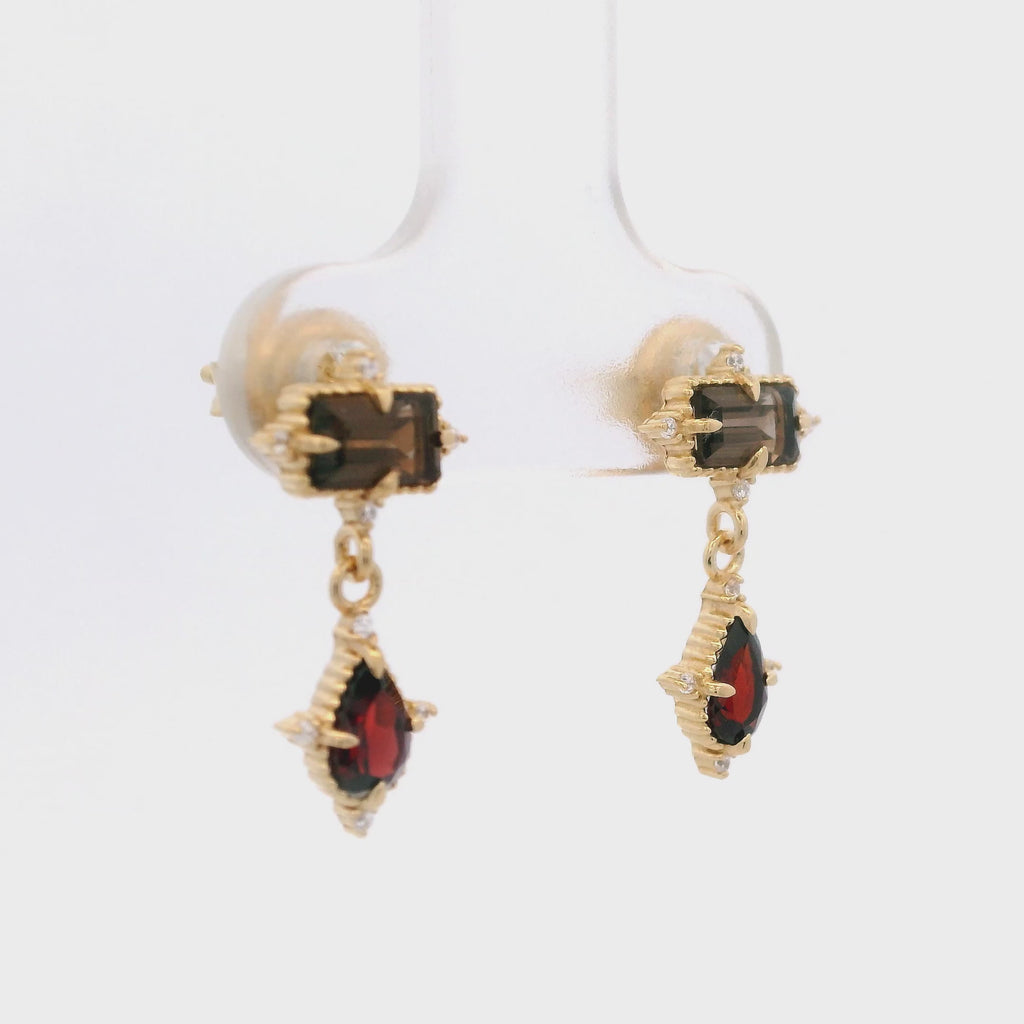 Aretes de Cuarzo Ahumado Rectangular con Colgante de Granate y Zirconia en Plata 925 Bañada en Oro.