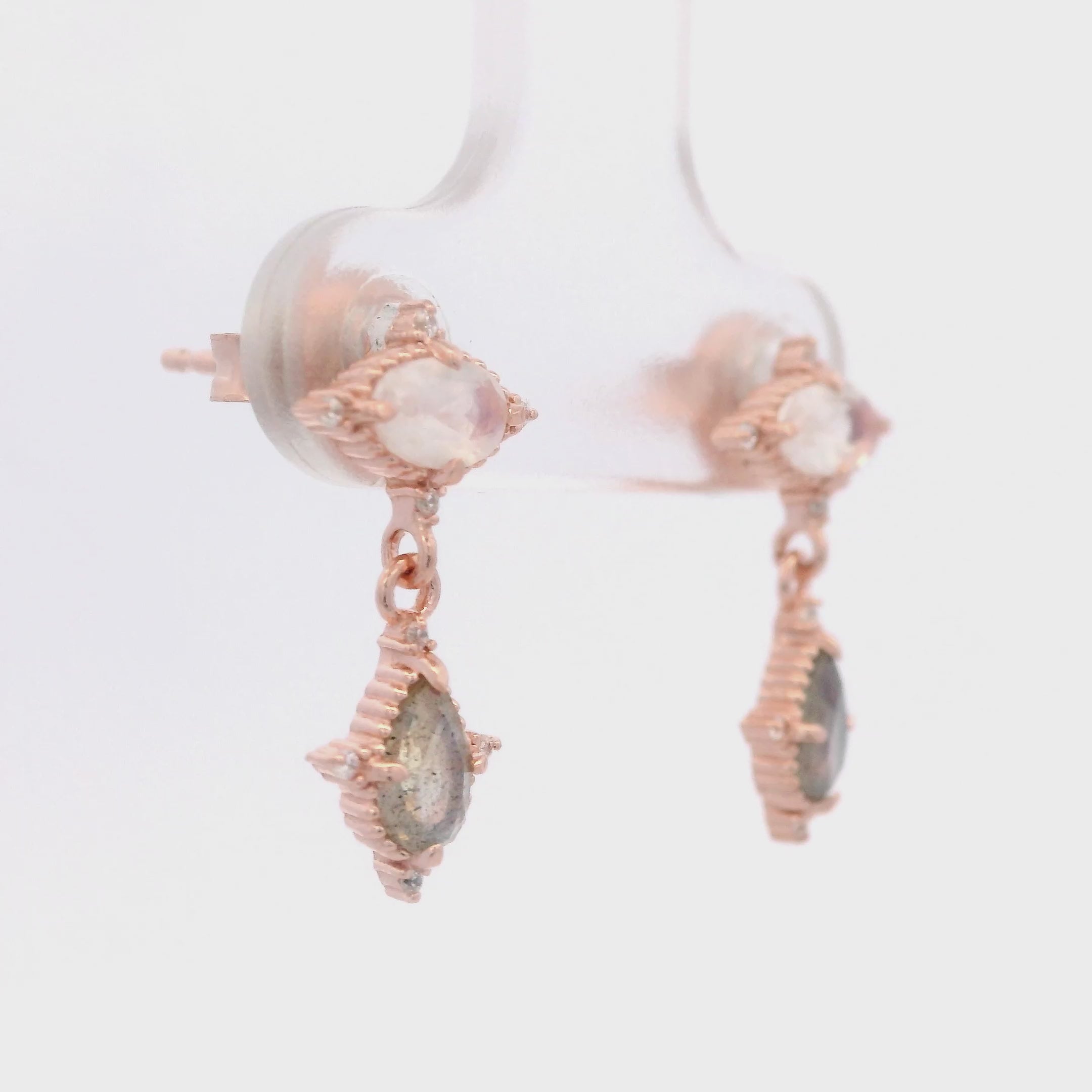 Aretes Colgantes de Piedra Luna Ovalada, Labradorita y Zirconia en Plata 925 Bañada en Oro Rosa.