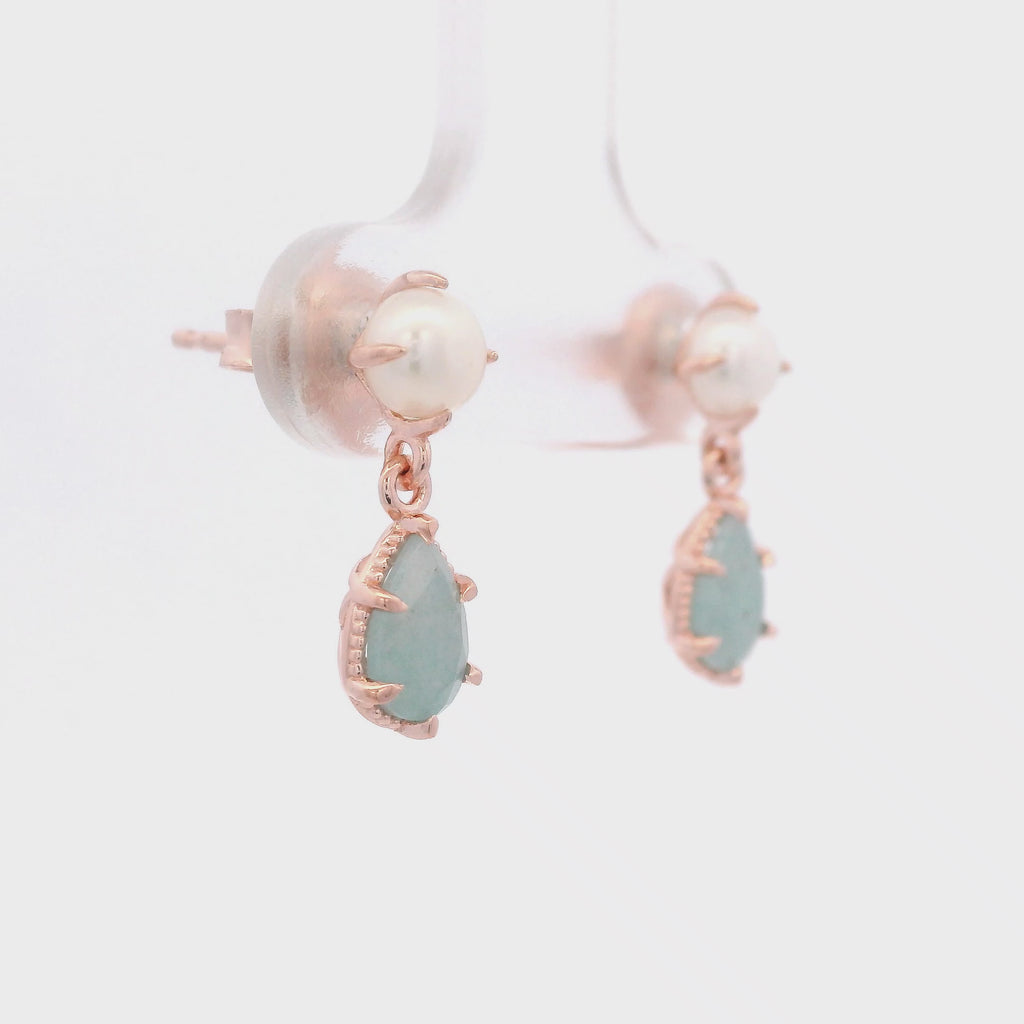 Aretes de Perla y Cuarzo Aqua Colgante en Plata 925 Bañada en Oro Rosa.