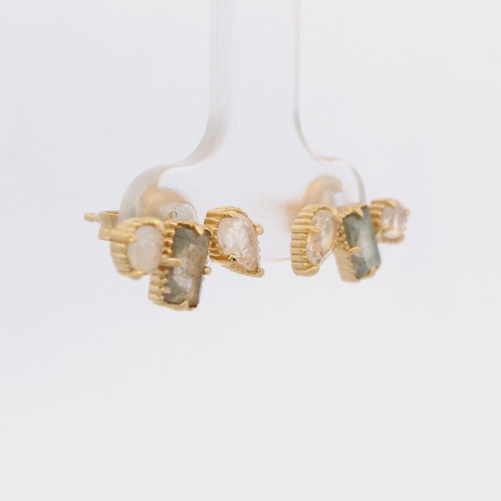 Aretes Multiforma con Centro de Labradorita y Piedra Luna en Plata 925 Bañada en Oro.