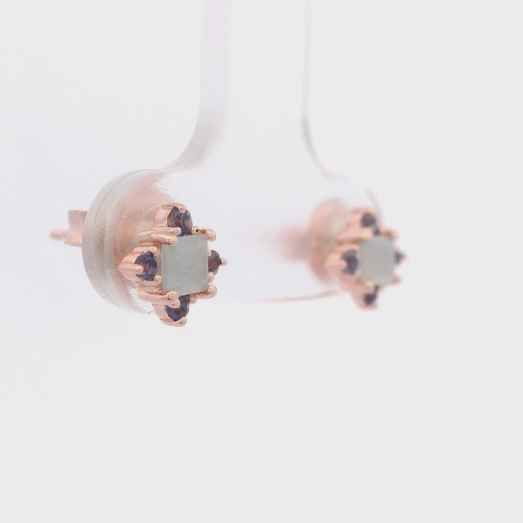 Aretes con Cuarzo Aqua Cuadrado y Puntas de Iolita en Plata 925 Bañada en Oro Rosa.