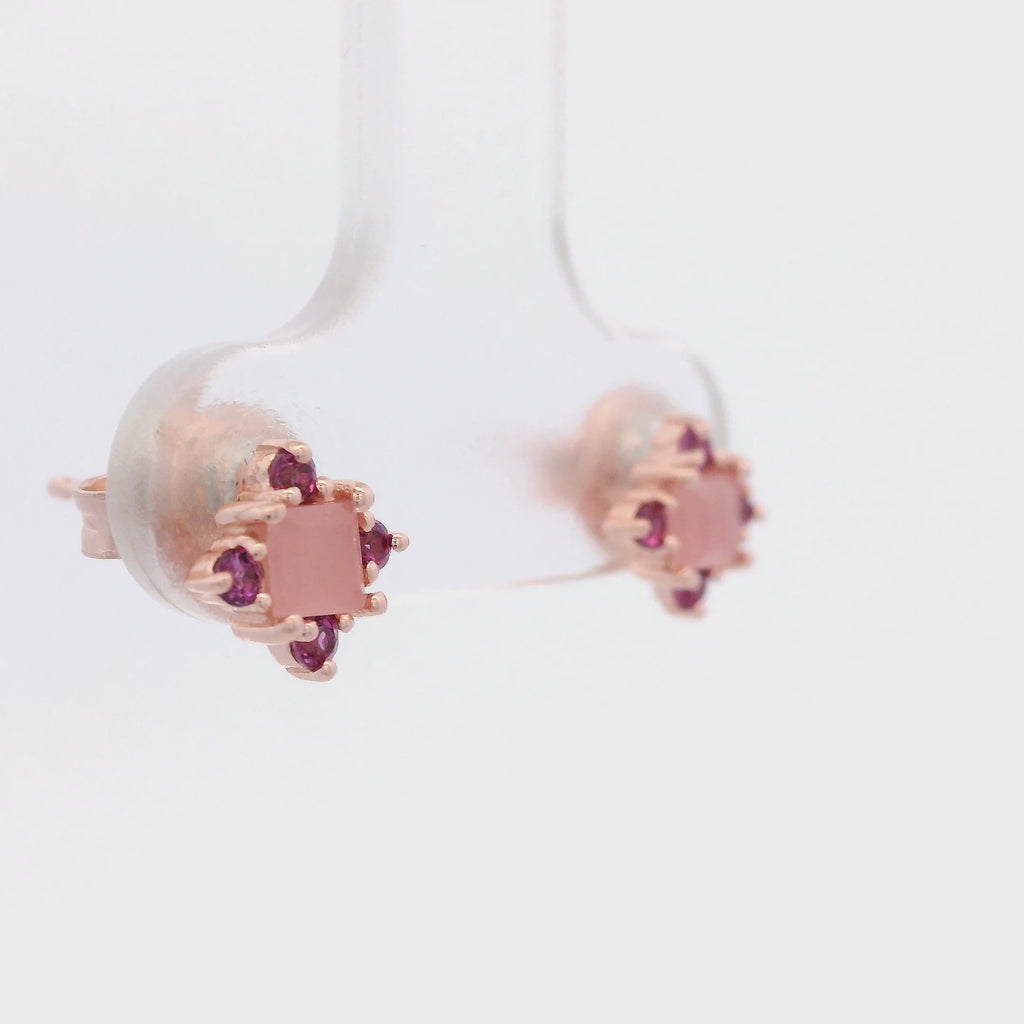 Aretes con Cuarzo Rosa Cuadrado y Punta de Granate en Plata 925 Bañada en Oro Rosa.