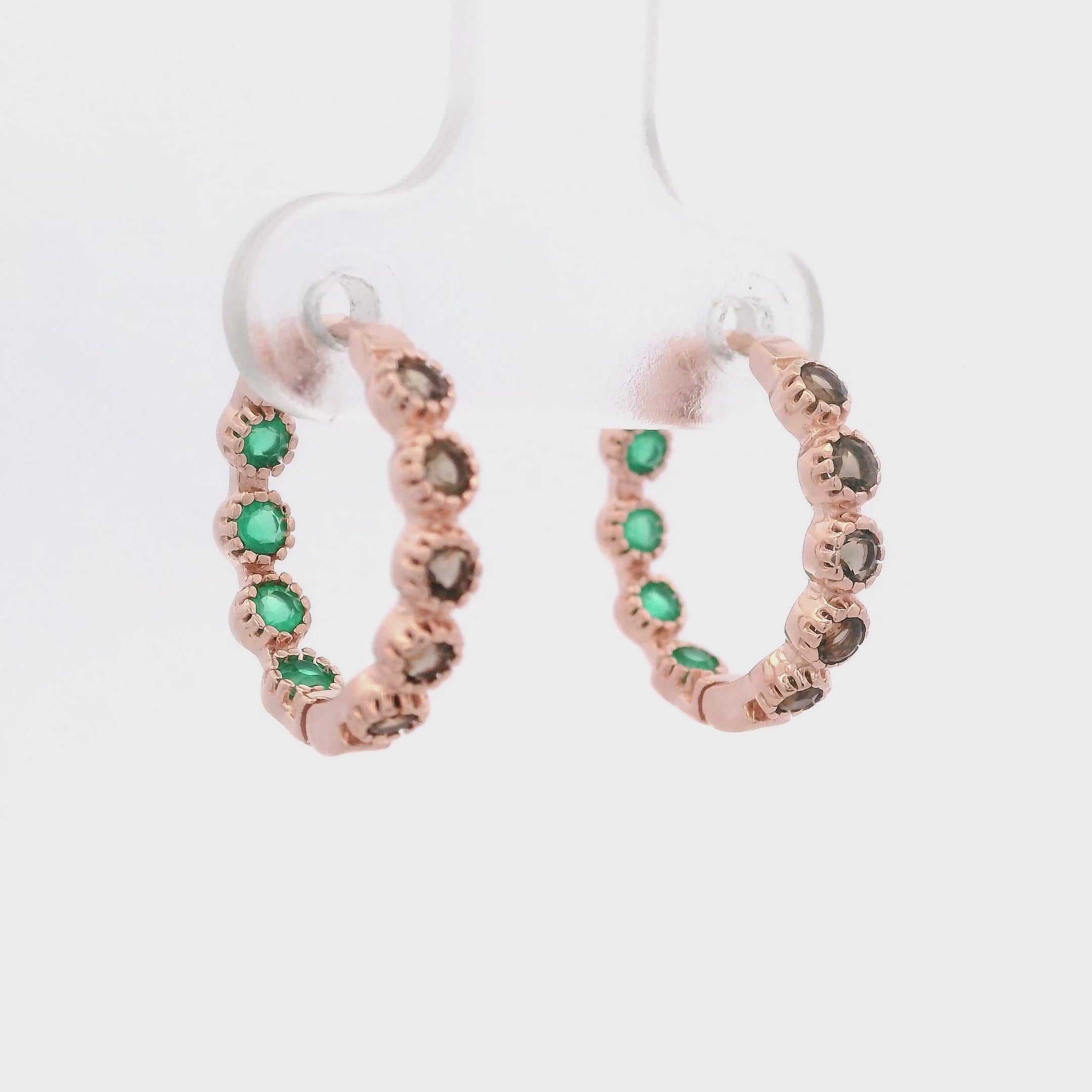 Huggies de Cinco Piedras con Cuarzo Ahumado y Ónix Verde en Plata 925 Bañada en Oro Rosa.