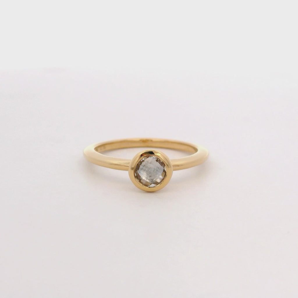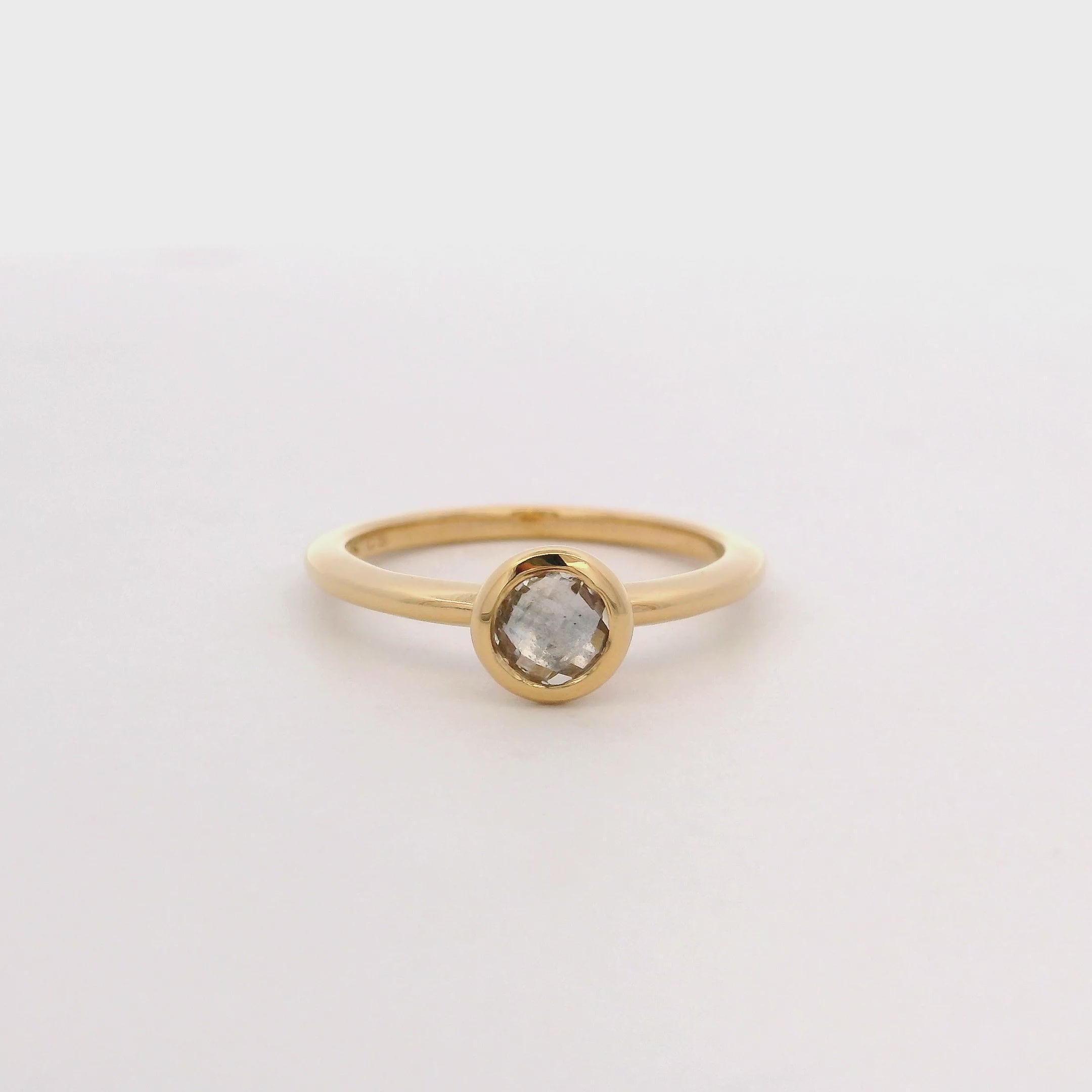 En resumen, es un anillo solitario de plata de ley con baño de oro amarillo, en Talla 6.5, cuyo diseño se centra en un único cristal de roca transparente de 6 mm engastado de forma segura con un bisel de metal.