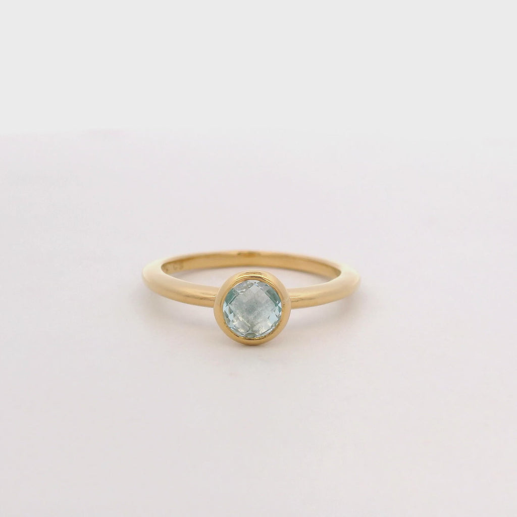 En resumen, es un anillo solitario de plata de ley con baño de oro amarillo, en Talla 6.5, cuyo diseño se centra en un único topacio azul de 6 mm engastado de forma segura con un bisel de metal.