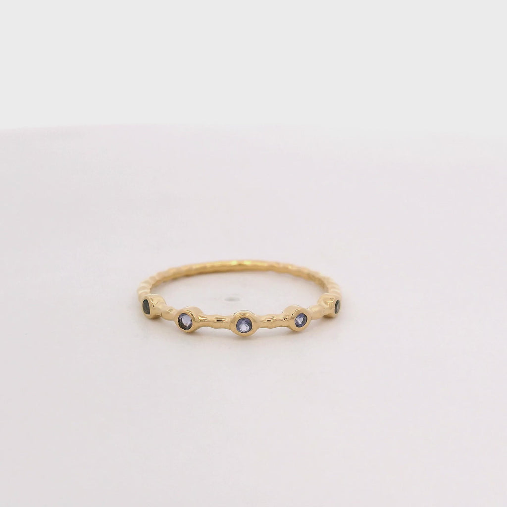 En resumen, se trata de un anillo con baño de oro amarillo que presenta una elegante hilera de cinco iolitas azules, cada una en un engaste de bisel, todo en talla 6.5.