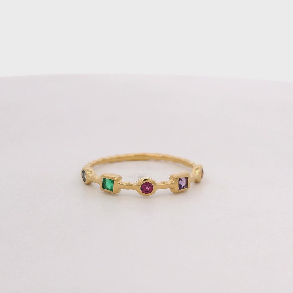 El diseño del anillo es muy versátil, presentando varias formas (MULTI SHAPE) de piedras, lo que significa que las gemas no tienen todas el mismo corte (por ejemplo, pueden ser redondas, ovaladas, cuadradas, etc.). Además, se trata de varias piedras (MULTI STONE), lo que indica que hay diferentes tipos o colores de gemas.
