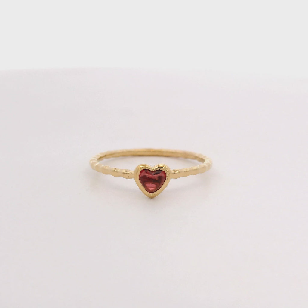 En resumen, se trata de un delicado anillo con baño de oro amarillo que presenta un granate rojo en forma de corazón, engastado con un mini bisel, todo en talla 6.5.