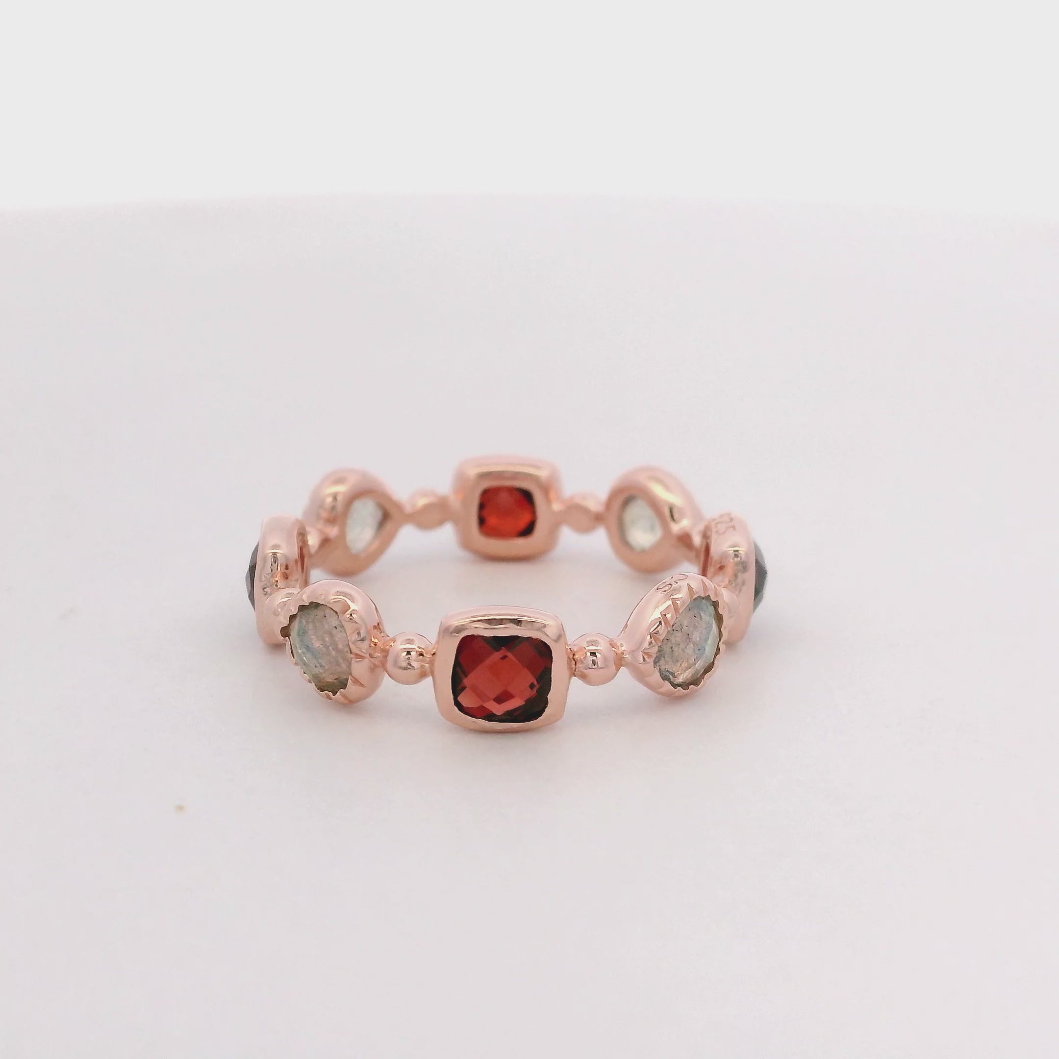 En resumen, se trata de un anillo con baño de oro rosa que presenta un diseño moderno con piedras de granate y labradorita distribuidas en estaciones, todo en talla 6.5.