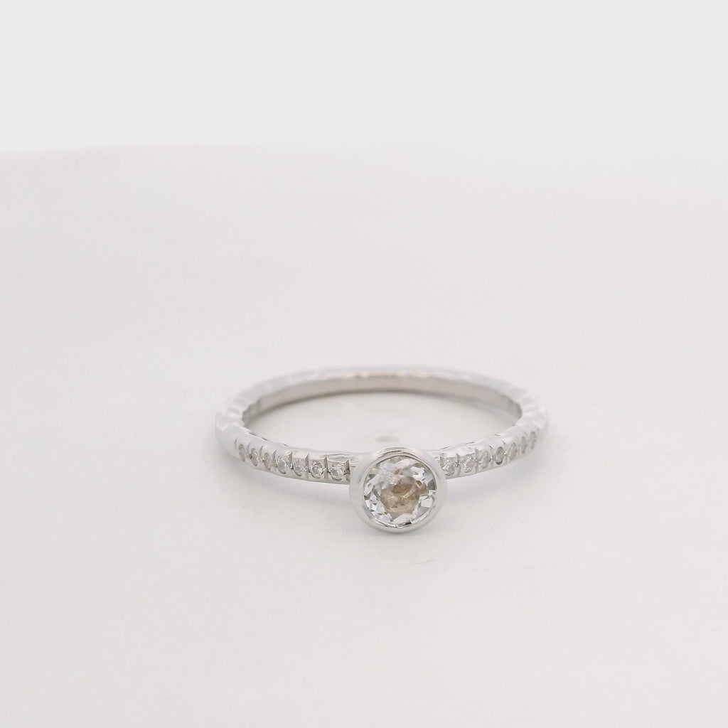 En resumen, se trata de un anillo de plata de ley que combina la claridad del cristal de roca con el brillo de la circonita cúbica, ambas engastadas con bisel, todo en talla 6.5.