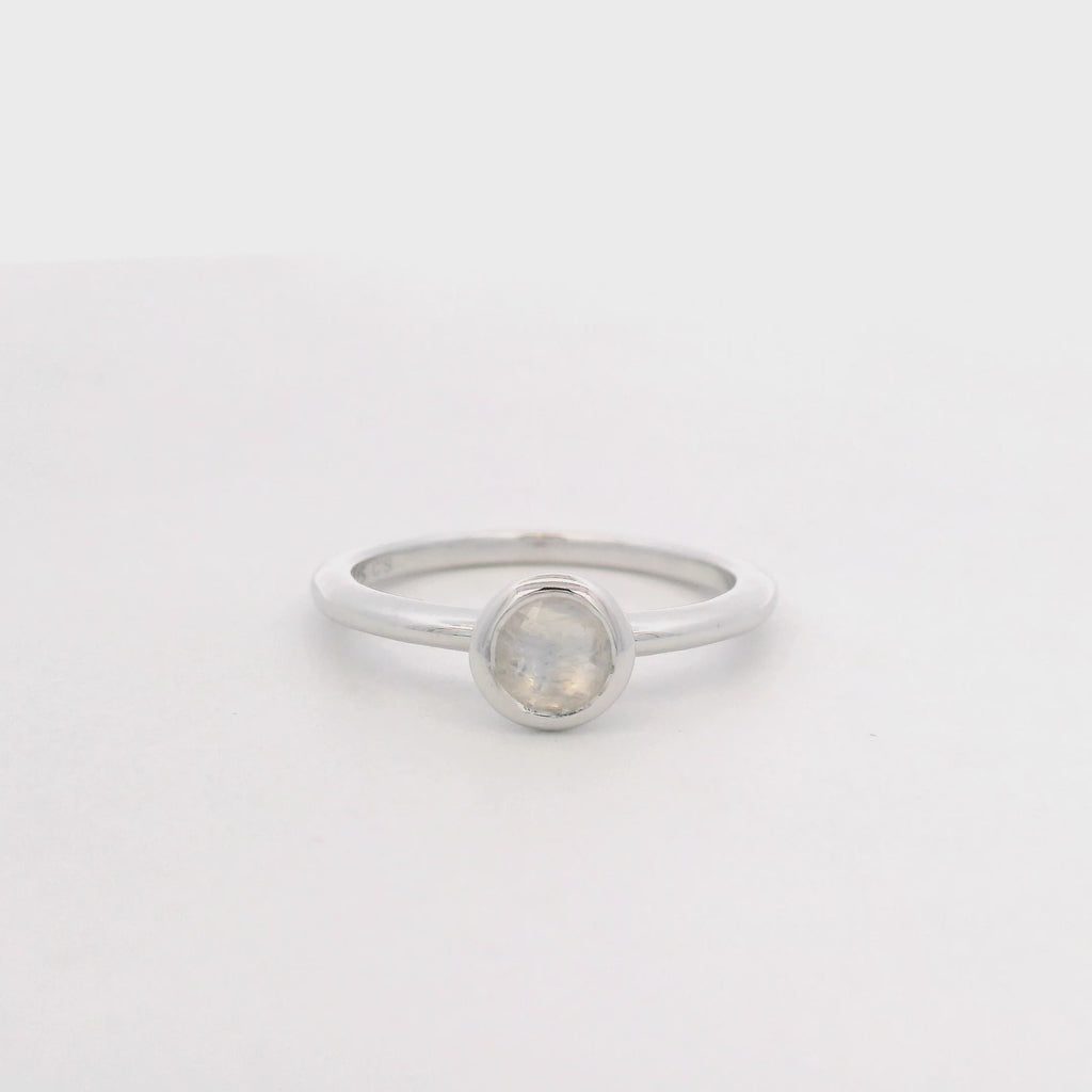 En resumen, se trata de un elegante anillo de plata de ley que presenta una única piedra luna iridiscente en un engaste de bisel, todo en talla 6.5.