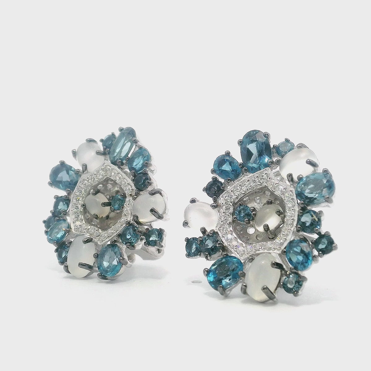 Elegantly crafted 925 sterling silver earrings featuring a circular design with London blue topaz and moonstone gemstones. The combination of deep blue topaz and luminous moonstone creates a sophisticated contrast, perfect for both everyday wear and special occasions. These high-quality earrings showcase expert craftsmanship and timeless appeal.