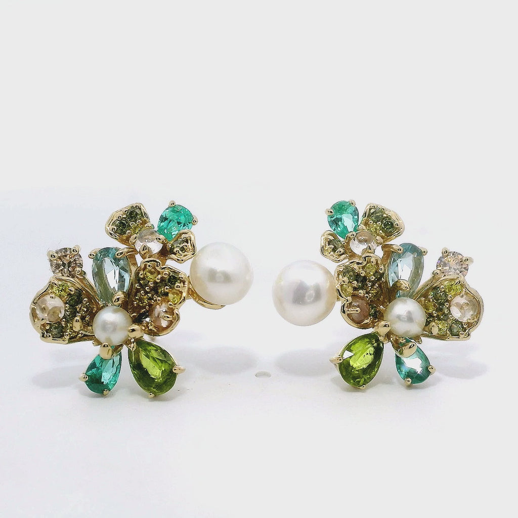 Exquisitely crafted 925 sterling silver earrings with yellow gold accents, featuring delicate flower designs adorned with vibrant green gemstones and lustrous pearls. These sophisticated earrings combine timeless elegance with contemporary styling, perfect for both special occasions and everyday luxury.