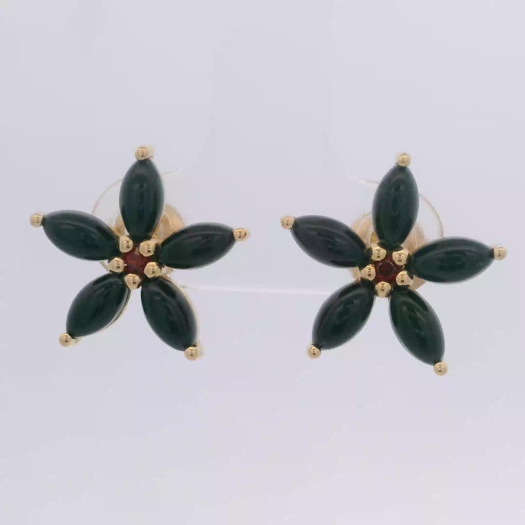 925YG FLOWER 15MM ONYX BLACK CENTER GARNET EARRINGS