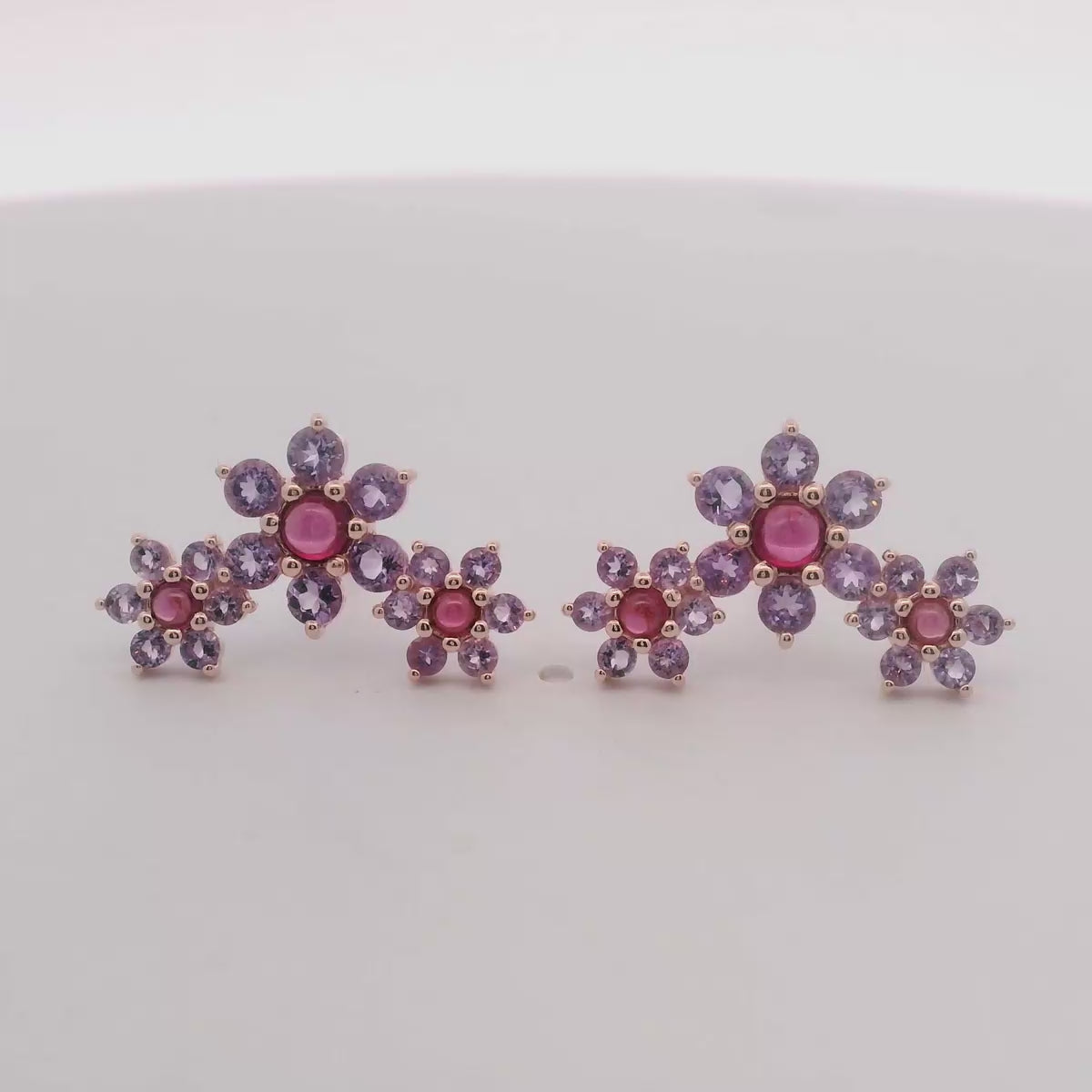 Introducing the 925RG Triple Flower Amethyst Center Garnet Earrings. Crafted with 925RG, these earrings feature a stunning triple flower design with a vibrant amethyst center and garnet accents. Elevate any outfit with their dazzling beauty and elegance.