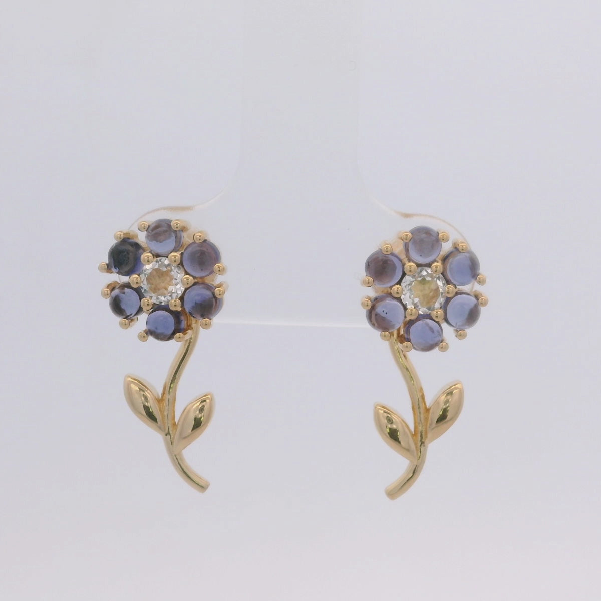 925YG FLOWER 8MM REMOVABLE STEM IOLITE CENTER TOPAZ WHITE EARRINGS