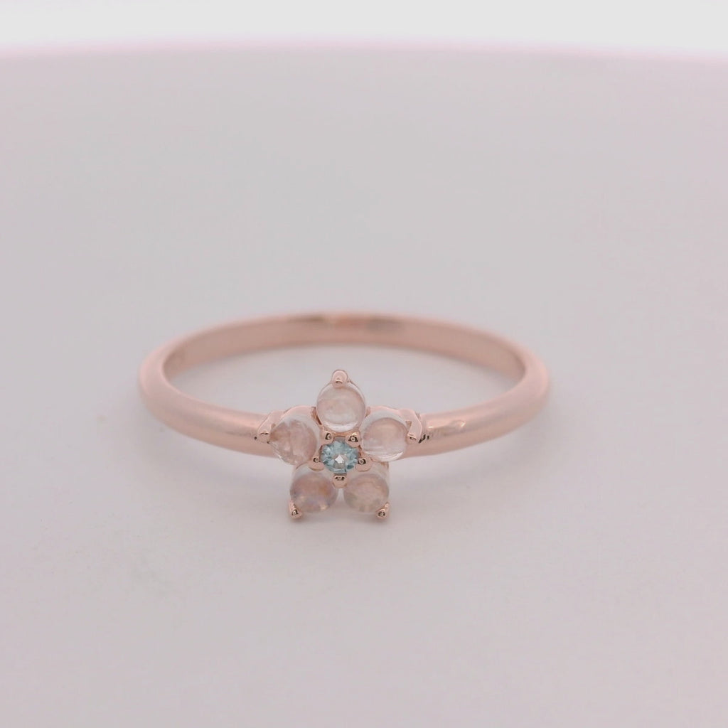 Enhance your style with this stunning 925RG flower ring featuring a 6mm moostone center and sparkling topaz blue accents. Crafted with high-quality materials, this ring exudes elegance and sophistication. Make a statement and elevate any outfit with this beautiful piece.