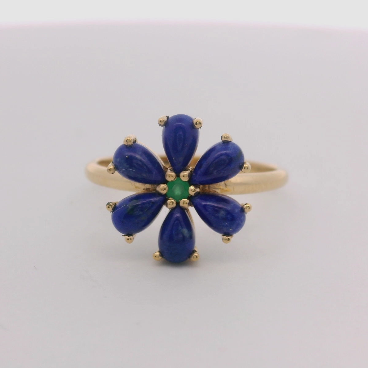 Expertly crafted in 925 yellow gold, this beautiful ring features a 12mm lapis lazuli center surrounded by green onyxs stones forming a delicate flower design. Elegant and unique, this ring is perfect for adding a pop of color to any outfit. Available in size 6.5.