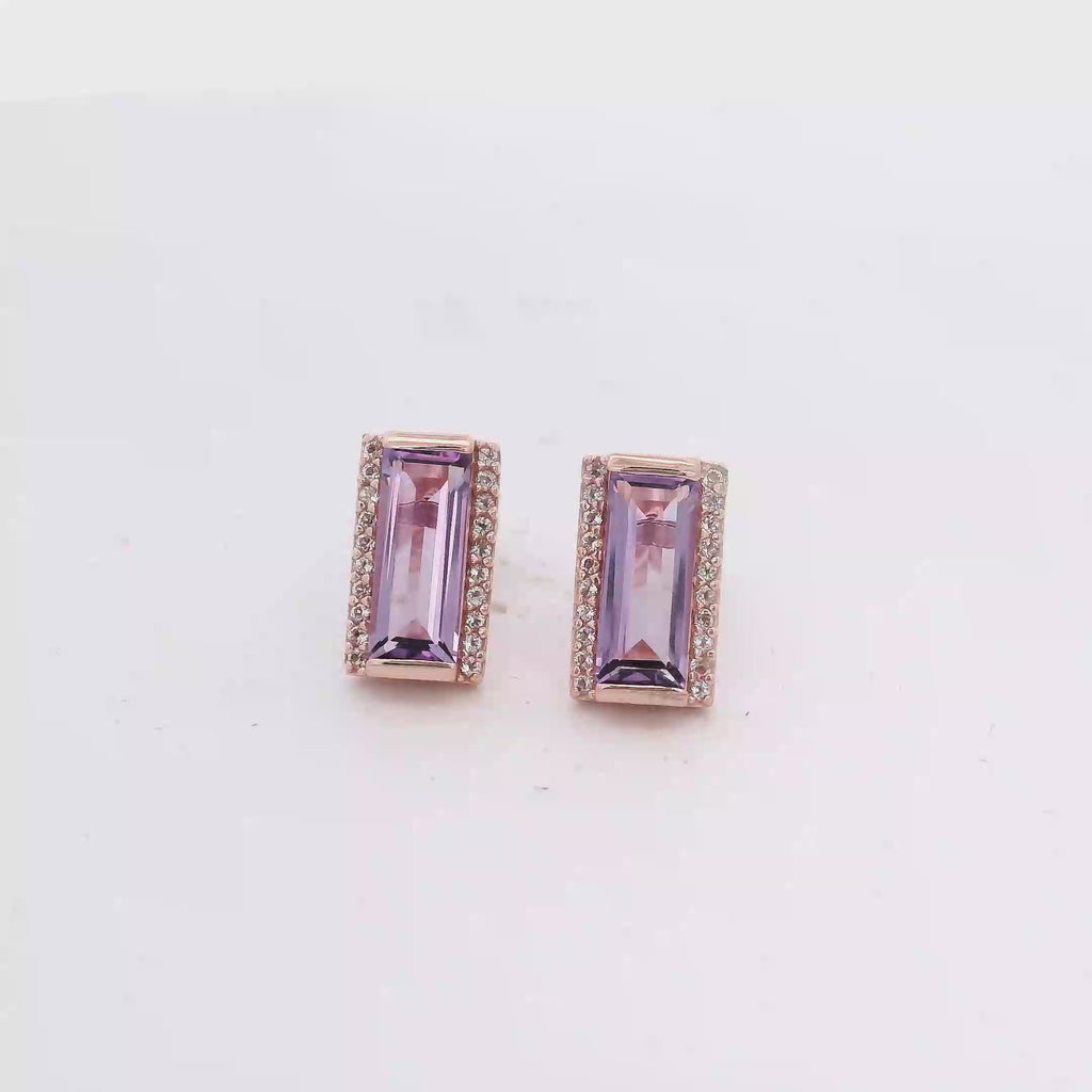 Elevate your elegance with these 925RG Solitary Baguette Amethyst and White Topaz Earrings. Featuring an 11mm design, the vibrant amethyst stones are beautifully complemented by sparkling white topaz, creating a stunning contrast that enhances any outfit. Crafted with precision in 925 rose gold, these earrings offer both durability and timeless style, perfect for adding a touch of sophistication to your look.